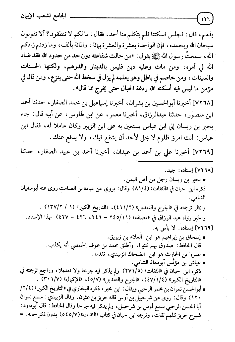 7269 - أَخْبَرَنَا عَلِيُّ بْنُ أَحْمَدَ بْنِ عَبْدَانَ، أنا أَحْمَدُ بْنُ عُبَيْدٍ الصَّفَّارُ، نا -[127]- أَبُو إِسْمَاعِيلَ التِّرْمِذِيُّ، حَدَّثَنِي إِسْحَاقُ بْنُ إِبْرَاهِيمَ، حَدَّثَنِي عَمْرُو بْنُ الْحَارِثِ، نا عَبْدُ اللهِ بْنُ سَالِمٍ، نا الزُّبَيْرُ بْنُ مُحَمَّدِ بْنِ الْوَلِيدِ، نا عَامِرٌ، نا عَيَّاشُ بْنُ مُؤْنِسٍ، أَنَّ أَبَا الْحَسَنِ نِمْرَانَ الرَّحَبِيَّ حَدَّثَهُ، أَنَّ أَوْسَ بْنَ شُرَحْبِيلَ - أَحَدَ بَنِي الْمَجْمَعِ - حَدَّثَهُ أَنَّهُ سَمِعَ رَسُولَ اللهِ صَلَّى اللَّهُ عَلَيْهِ وَسَلَّمَ يَقُولُ: §" مَنْ مَشَى مَعَ ظَالِمٍ يُقَوِّيهِ وَهُوَ يَعْلَمُ أَنَّهُ ظَالِمٌ فَقَدْ خَرَجَ مِنَ الْإِسْلَامِ " لَمْ يُثْبِتْ شَيْخُنَا إِسْنَادَهُ، وَهُوَ كَمَا كَتَبْتُهُ صَحِيحٌ لَا شَكَّ فِيهِ، وَقَالَ جَرِيرُ بْنُ عُثْمَانَ مَرَّةً: شُرَحْبِيلُ بْنُ أَوْسٍ