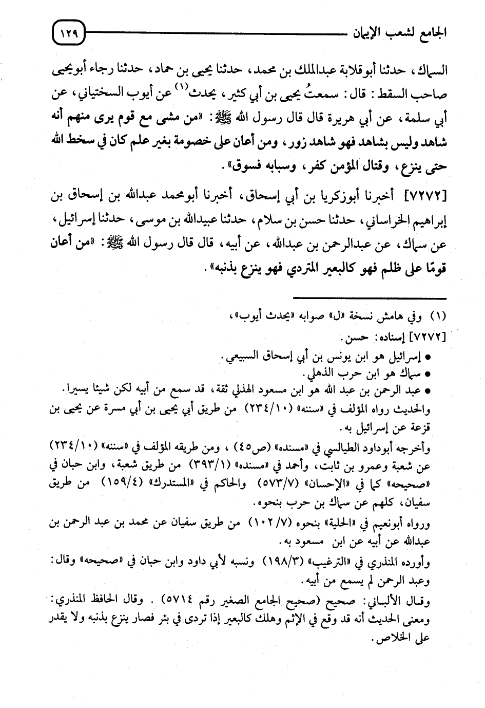 7272 - أَخْبَرَنَا أَبُو زَكَرِيَّا بْنُ أَبِي إِسْحَاقَ، أنا أَبُو مُحَمَّدٍ عَبْدُ اللهِ بْنُ إِسْحَاقَ، نا إِبْرَاهِيمُ بْنُ الْخُرَاسَانِيِّ، نا الْحَسَنُ بْنُ سَلَّامٍ، نا عُبَيْدُ اللهِ بْنُ مُوسَى، نا إِسْرَائِيلُ، عَنْ سِمَاكٍ، عَنْ عَبْدِ الرَّحْمَنِ بْنِ عَبْدِ اللهِ، عَنْ أَبِيهِ، قَالَ: قَالَ رَسُولُ اللهِ صَلَّى اللَّهُ عَلَيْهِ وَسَلَّمَ: §" مَنْ أَعَانَ قَوْمًا عَلَى ظُلْمٍ فَهُوَ كَالْبَعِيرِ الْمُتَرَدِّي، فَهُوَ يَنْزِعُ بِذَنَبِهِ "