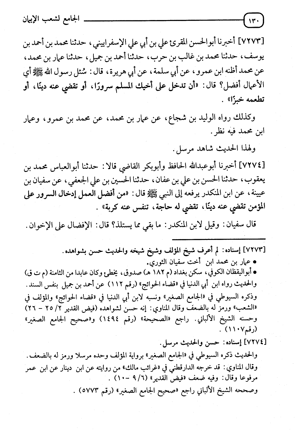 7273 - أَخْبَرَنَا أَبُو الْحَسَنِ الْمُقْرِئُ عَلِيُّ بْنُ أَبِي عَلِيٍّ الْإِسْفَرَايِينِيُّ، نا مُحَمَّدُ بْنُ أَحْمَدَ بْنِ يُوسُفَ، نا مُحَمَّدُ بْنُ غَالِبِ بْنِ حَرْبٍ، نا أَحْمَدُ بْنُ جَمِيلٍ، نا عُمَارَةُ بْنُ مُحَمَّدٍ، عَنْ مُحَمَّدٍ، - أَظُنُّهُ ابْنَ عَمْرٍو - عَنْ أَبِي سَلَمَةَ، عَنْ أَبِي هُرَيْرَةَ، قَالَ: سُئِلَ رَسُولُ اللهِ صَلَّى اللَّهُ عَلَيْهِ وَسَلَّمَ: أَيُّ الْأَعْمَالِ أَفْضَلُ؟ قَالَ: " أَنْ §تُدْخِلَ عَلَى أَخِيكَ الْمُسْلِمِ سُرُورًا أَوْ تَقْضِي عَنْهُ دَيْنًا، أَوْ تُطْعِمَهُ خُبْزًا " وَكَذَلِكَ رَوَاهُ الْوَلِيدُ بْنُ شُجَاعٍ، عَنْ عَمَّارِ بْنِ مُحَمَّدٍ، عَنْ مُحَمَّدِ بْنِ عَمْرٍو، وَعَمَّارُ بْنُ مُحَمَّدٍ فِيهِ نَظَرٌ، وَهَذَا الْحَدِيثُ شَاهِدٌ مُرْسَلٌ