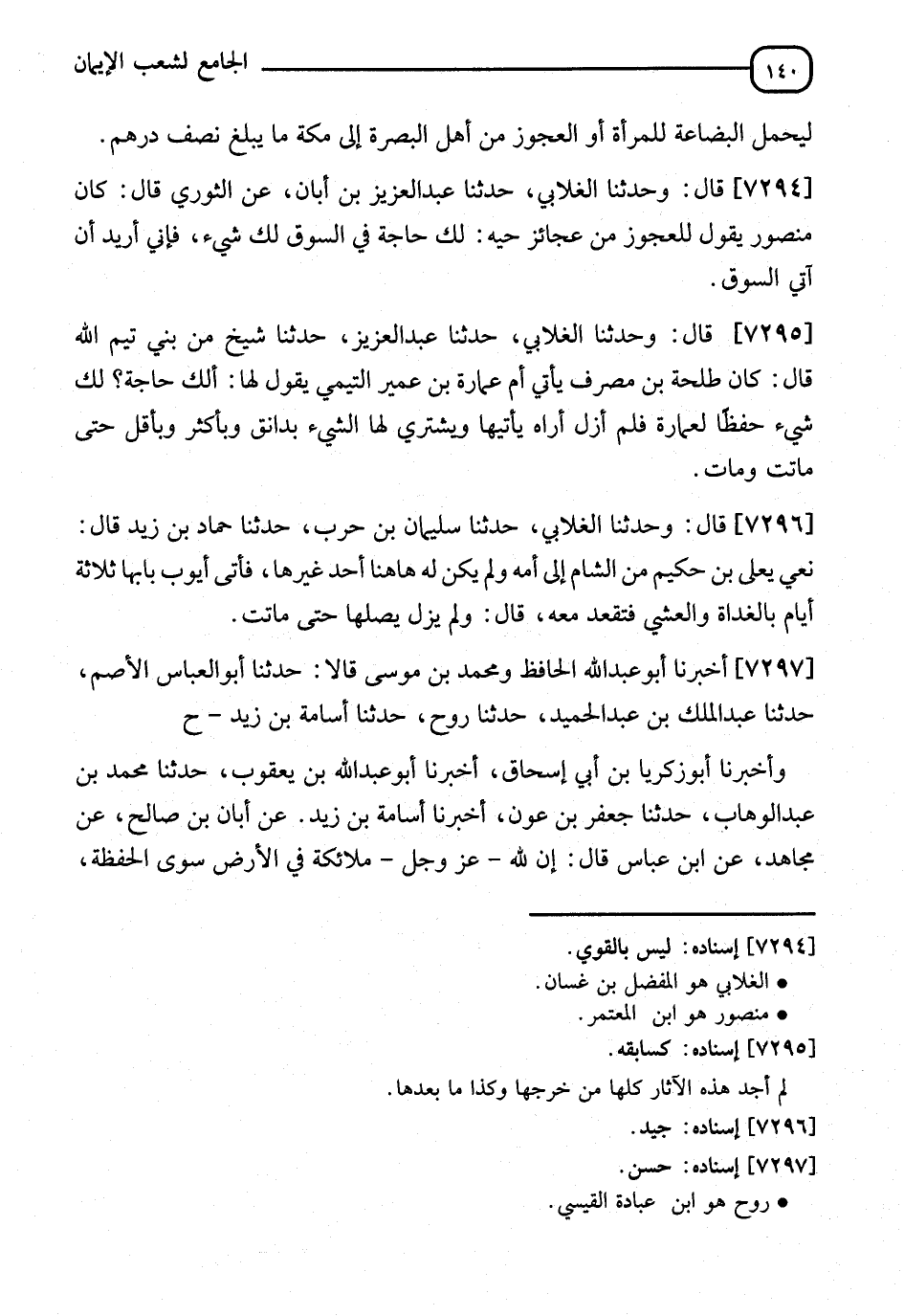 7297 - أَخْبَرَنَا أَبُو عَبْدِ اللهِ الْحَافِظُ، وَمُحَمَّدُ بْنُ مُوسَى، قَالَا: نا أَبُو الْعَبَّاسِ الْأَصَمُّ، نا عَبْدُ الْمَلِكِ بْنُ عَبْدِ الْحَمِيدِ، نا رَوْحٌ، نا أُسَامَةُ بْنُ زَيْدٍ، ح وَأَخْبَرَنَا أَبُو زَكَرِيَّا بْنُ أَبِي إِسْحَاقَ، أنا أَبُو عَبْدِ اللهِ بْنُ يَعْقُوبَ، نا مُحَمَّدُ بْنُ عَبْدِ الْوَهَّابِ، نا جَعْفَرُ بْنُ عَوْنٍ، أنا أُسَامَةُ بْنُ زَيْدٍ، عَنْ أَبَانَ بْنِ صَالِحٍ، عَنْ مُجَاهِدٍ، عَنِ ابْنِ عَبَّاسٍ، قَالَ: " إِنَّ §لِلَّهِ عَزَّ وَجَلَّ مَلَائِكَةً فِي الْأَرْضِ سِوَى الْحَفَظَةِ -[141]- يَكْتُبُونَ مَا يَسْقُطُ مِنْ وَرَقِ الشَّجَرِ، فَإِذَا أَصَابَ أَحَدَكُمْ عَرْجَةٌ فِي الْأَرْضِ لَا يَقْدِرُ فِيهَا عَلَى الْأَعْوَانِ فَلْيَصِحْ، فَلْيَقُلْ: عِبَادَ اللهِ أَغِيثُونَا أَوْ أَعِينُونَا رَحِمَكُمُ اللهُ، فَإِنَّهُ سَيُعَانُ " لَفْظُ حَدِيثِ جَعْفَرٍ، وَفِي رِوَايَةِ رَوْحٍ: " إِنَّ لِلَّهِ مَلَائِكَةً فِي الْأَرْضِ يُسَمَّونَ الْحَفَظَةَ، يَكْتُبُونَ مَا يَقَعُ فِي الْأَرْضِ مِنْ وَرَقِ الشَّجَرِ، فَمَا أَصَابَ أَحَدًا مِنْكُمْ عَرْجَةٌ أَوِ احْتَاجَ إِلَى عَوْنٍ بِفَلَاةٍ مِنَ الْأَرْضِ فَلْيَقُلْ: أَعِينُونَا عِبَادَ اللهِ، رَحِمَكُمُ اللهُ، فَإِنَّهُ يُعَانُ إِنْ شَاءَ اللهُ "