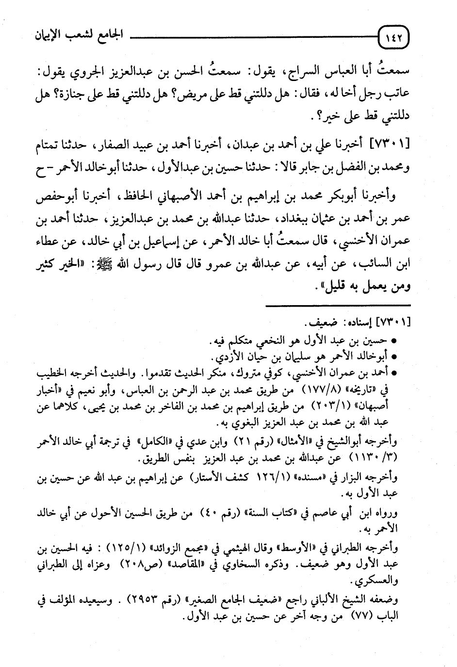 7301 - أَخْبَرَنَا عَلِيُّ بْنُ أَحْمَدَ بْنِ عَبْدَانَ، أنا أَحْمَدُ بْنُ عُبَيْدٍ الصَّفَّارُ، نا تَمْتَامٌ، وَمُحَمَّدُ بْنُ الْفَضْلِ بْنِ جَابِرٍ، قَالَا: نا حَسَنُ بْنُ عَبْدِ الْأَوَّلِ، نا أَبُو خَالِدٍ الْأَحْمَرُ، وَأَخْبَرَنَا أَبُو بَكْرٍ مُحَمَّدٌ، عَنْ إِبْرَاهِيمَ بْنِ أَحْمَدَ الْأَصْبَهَانِيِّ الْحَافِظِ، أنا أَبُو حَفْصٍ عُمَرُ بْنُ أَحْمَدَ بْنِ عُثْمَانَ، بِبَغْدَادَ، نا عَبْدُ اللهِ بْنُ مُحَمَّدِ بْنِ عَبْدِ الْعَزِيزِ، نا أَحْمَدُ بْنُ عِمْرَانَ الْأَخْنَسِيُّ، قَالَ: سَمِعْتُ أَبَا خَالِدٍ الْأَحْمَرَ، عَنْ إِسْمَاعِيلَ بْنِ أَبِي خَالِدٍ، عَنْ عَطَاءِ بْنِ السَّائِبِ، عَنْ أَبِيهِ، عَنْ عَبْدِ اللهِ بْنِ عَمْرٍو، قَالَ: قَالَ رَسُولُ اللهِ صَلَّى اللَّهُ عَلَيْهِ وَسَلَّمَ: " §الْخَيْرُ كَثِيرٌ، وَمَنْ يَعْمَلْ بِهِ قَلِيلٌ " -[143]- لَفْظُ حَدِيثِ تَمْتَامٍ، قَالَ ابْنُ جَابِرٍ: سَمِعْتُ إِسْمَاعِيلَ بْنَ أَبِي خَالِدٍ، عَنْ عَطَاءٍ الْحَدِيثَ، وَقَالَ الْأَخْنَسُ: عَنْ رَسُولِ اللهِ صَلَّى اللَّهُ عَلَيْهِ وَسَلَّمَ