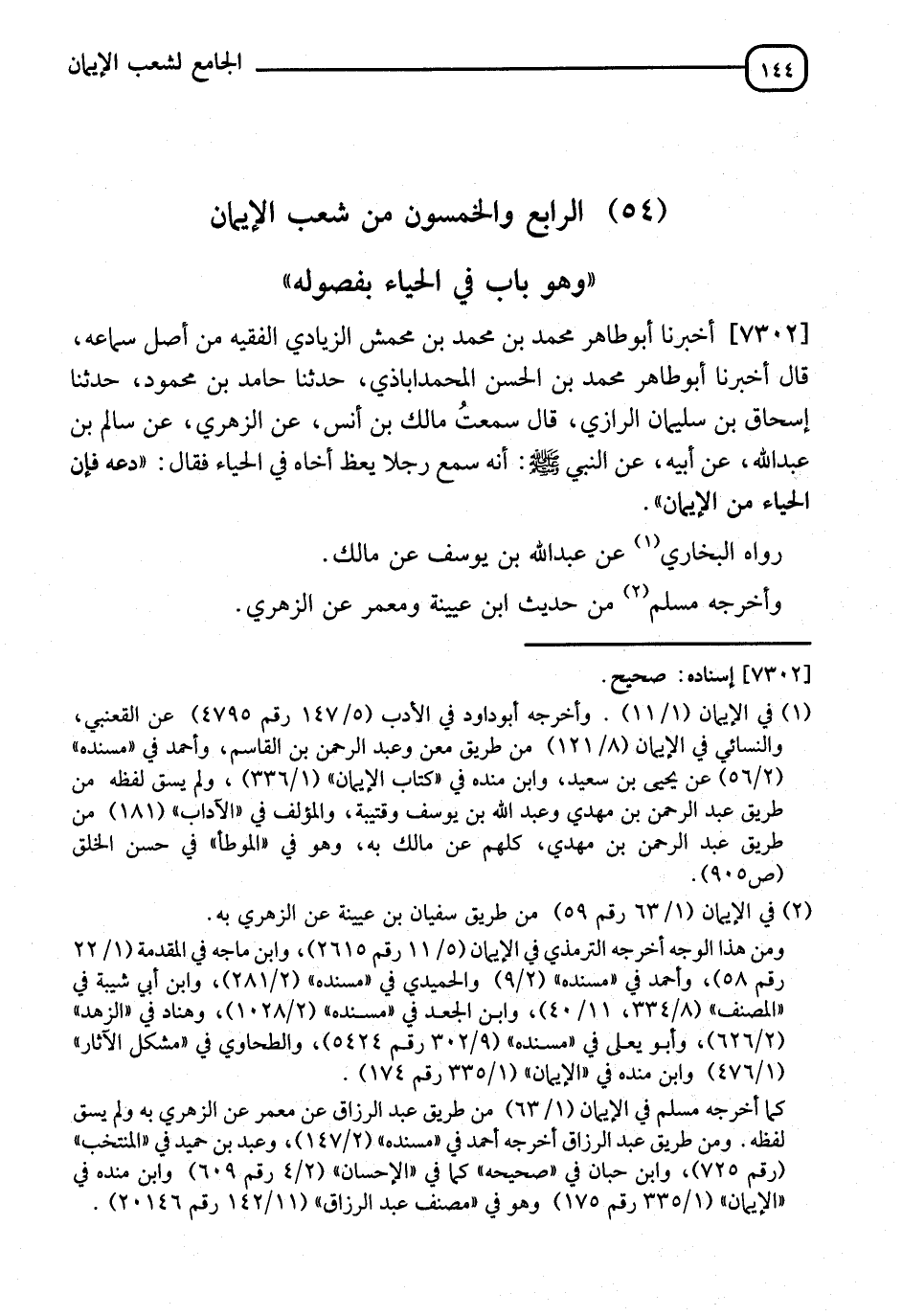 §الرَّابِعُ وَالْخَمْسُونَ مِنْ شُعَبِ الْإِيمَانِ، وَهُوَ بَابُ الْحَيَاءِ بِفُصُولِهِ