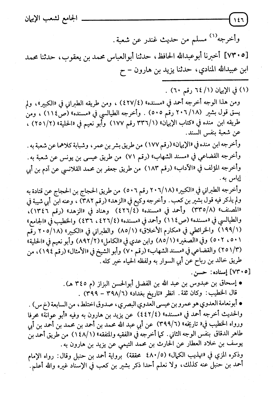 7305 - أَخْبَرَنَا أَبُو عَبْدِ اللهِ الْحَافِظُ، نا أَبُو الْعَبَّاسِ مُحَمَّدُ بْنُ يَعْقُوبَ، نا مُحَمَّدُ بْنُ عُبَيْدِ اللهِ الْمُنَادِي، نا يَزِيدُ بْنُ هَارُونَ، ح -[147]- وَأَخْبَرَنَا أَبُو عَبْدِ اللهِ مُحَمَّدُ بْنُ أَحْمَدَ بْنِ أَبِي طَاهِرٍ الدَّقَّاقُ، بِبَغْدَادَ، أنا أَبُو الْحَسَنِ إِسْحَاقُ بْنُ عُبْدُوسِ بْنِ عَبْدِ اللهِ بْنِ الْفَضْلِ الْبَزَّارُ، نا الْحَارِثُ بْنُ أَبِي أُسَامَةَ، نا يَزِيدُ بْنُ هَارُونَ، أنا أَبُو نَعَامَةَ الْعَدَوِيُّ، عَنْ حُمَيْدِ بْنِ هِلَالٍ، عَنْ بَشِيرِ بْنِ كَعْبٍ، عَنْ عِمْرَانَ بْنِ حُصَيْنٍ، قَالَ: قَالَ رَسُولُ اللهِ صَلَّى اللَّهُ عَلَيْهِ وَسَلَّمَ: " §الْحَيَاءُ خَيْرٌ كُلُّهُ " قَالَ بَشِيرٌ: فَقُلْتُ: إِنَّ مِنْهُ ضَعْفًا، وَإِنَّ مِنْهُ عَجْزًا، فَقَالَ: أُحَدِّثُكَ عَنْ رَسُولِ اللهِ صَلَّى اللَّهُ عَلَيْهِ وَسَلَّمَ، وَتَجِيءُ بِالْمَعَارِيضِ؟ لَا أُحَدِّثُكَ بِحَدِيثٍ مَا عَرَفْتُكَ، فَقَالُوا: يَا أَبَا نُجَيْدٍ، إِنَّهُ طِيبٌ وَإِنَّهُ، فَلَمْ يَزَالُوا بِهِ حَتَّى سَكَنَ وَحَدَّثَ، لَفْظُهُمَا سَوَاءٌ، كَذَا قَالَ فِي إِسْنَادِهِ: عَنْ أَبِي نَعَامَةَ، عَنْ حُمَيْدِ بْنِ هِلَالٍ، عَنْ بَشِيرٍ، عَنْ عِمْرَانَ، وَخَالَفَهُ النَّضْرُ بْنُ شُمَيْلٍ، فَرَوَاهُ عَنْ أَبِي نَعَامَةَ