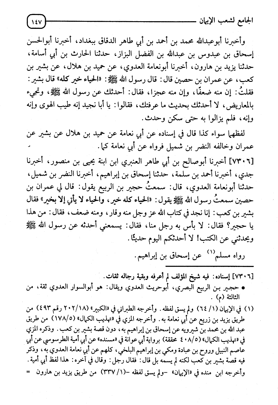 7306 - كَمَا أَخْبَرَنَا أَبُو صَالِحِ بْنُ أَبِي طَاهِرٍ الْعَنْبَرِيُّ ابْنُ بِنْتِ يَحْيَى بْنِ مَنْصُورٍ الْقَاضِي، أنا جَدِّي، نا أَحْمَدُ بْنُ سَلَمَةَ، نا إِسْحَاقُ بْنُ إِبْرَاهِيمَ، أنا النَّضْرُ بْنُ شُمَيْلٍ، نا أَبُو نَعَامَةَ الْعَدَوِيُّ، سَمِعْتُ حُجَيْرَ بْنَ الرَّبِيعِ، يَقُولُ: قَالَ لِي عِمْرَانُ بْنُ حُصَيْنٍ: سَمِعْتُ رَسُولَ اللهِ صَلَّى اللَّهُ عَلَيْهِ وَسَلَّمَ يَقُولُ: " §الْحَيَاءُ كُلُّهُ خَيْرٌ، وَالْحَيَاءُ لَا يَأْتِي إِلَّا بِخَيْرٍ " فَقَالَ بُشَيْرُ بْنُ كَعْبٍ: إِنَّا نَجِدُ فِي كِتَابِ اللهِ عَزَّ وَجَلَّ: مِنْهُ وَقَارٌ، وَمِنْهُ ضَعْفٌ، فَقَالَ: مَنْ هَذَا يَا حُجَيْرُ؟ فَقَالَ: لَا بَأْسَ بِهِ رَجُلٌ مِنَّا فَقَالَ: تَسْمَعُنِي أُحَدِّثُهُ عَنْ رَسُولِ اللهِ صَلَّى اللَّهُ عَلَيْهِ وَسَلَّمَ وَتُحَدِّثُنِي عَنِ الْكُتُبِ؟ لَا أُحَدِّثَكُمُ الْيَوْمَ حَدِيثًا، رَوَاهُ مُسْلِمٌ، عَنْ إِسْحَاقَ بْنِ إِبْرَاهِيمَ