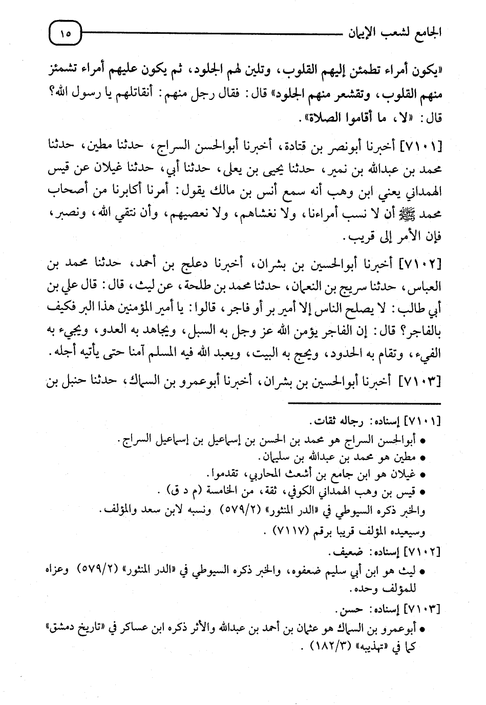 7101 - أَخْبَرَنَا أَبُو نَصْرِ بْنُ قَتَادَةَ، نا أَبُو الْحَسَنِ السَّرَّاجِ، نا مُطَيَّنٌ، نا مُحَمَّدُ بْنُ عَبْدِ اللهِ بْنِ نُمَيْرٍ، نا يَحْيَى بْنُ يَعْلَى، نا أَبِي، نا غَيْلَانُ، عَنْ قَيْسٍ الْهَمْدَانِيِّ يَعْنِي ابْنَ وَهْبٍ، أَنَّهُ سَمِعَ أَنَسَ بْنَ مَالِكٍ، يَقُولُ: " أَمَرَنَا أَكَابِرُنَا مِنْ أَصْحَابِ مُحَمَّدٍ صَلَّى اللَّهُ عَلَيْهِ وَسَلَّمَ: أَنْ §لَا نَسُبَّ أُمَرَاءَنَا، وَلَا نَغُشَّهُمْ، وَلَا نَعْصِيَهُمْ، وَأَنْ نَتَّقِيَ اللهَ وَنَصْبِرَ، فَإِنَّ الْأَمْرَ قَرِيبٌ "