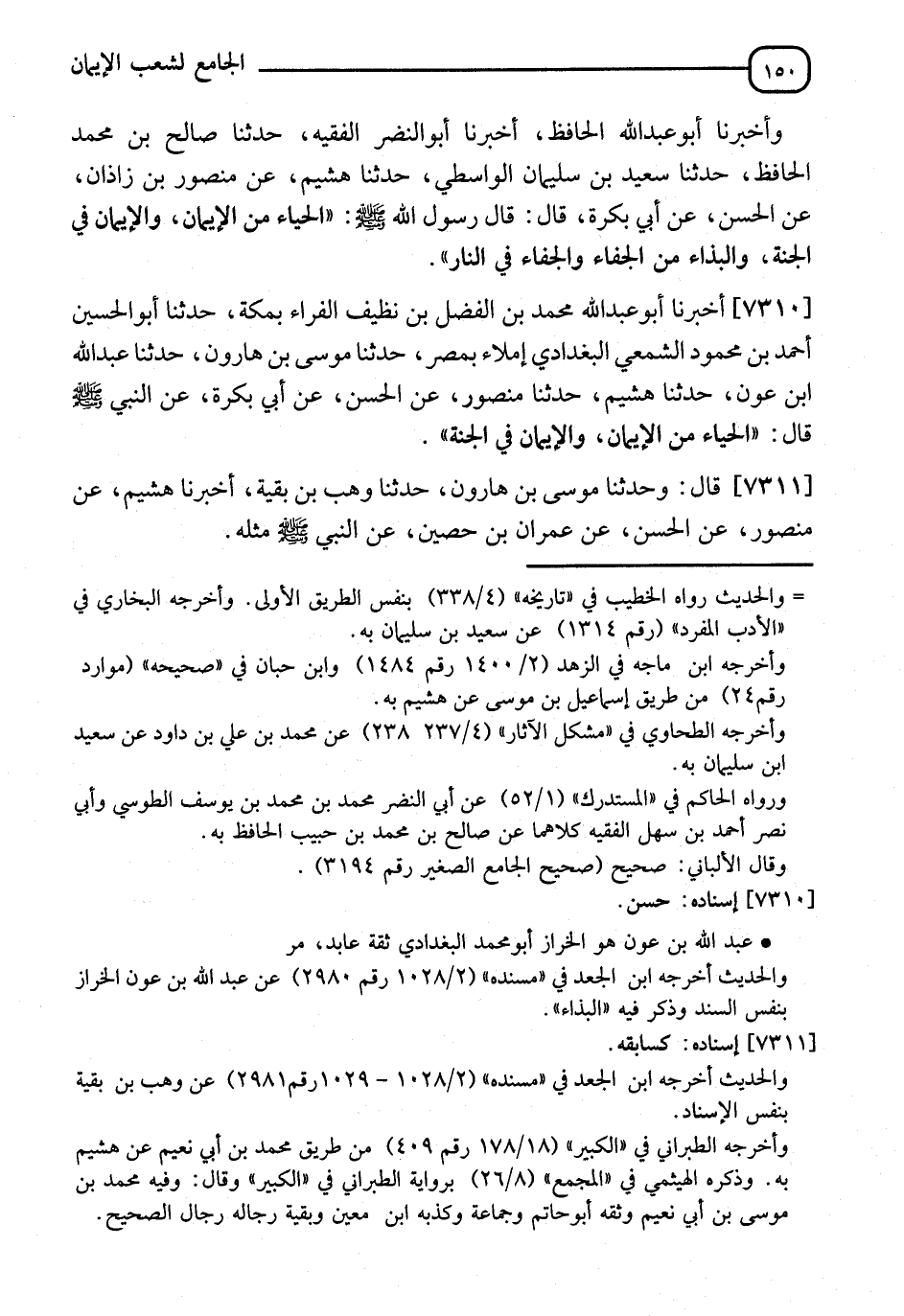 7310 - أَخْبَرَنَا أَبُو عَبْدِ اللهِ مُحَمَّدُ بْنُ الْفَضْلِ بْنِ نَطِيفِ الْفِرَا، بِمَكَّةَ، نا أَبُو الْحُسَيْنِ أَحْمَدُ بْنُ مَحْمُودٍ السَّبِيعِيُّ الْبَغْدَادِيُّ إِمْلَاءً بِمِصْرَ، نا مُوسَى بْنُ هَارُونَ، نا عَبْدُ اللهِ بْنُ عَوْنٍ، نا هُشَيْمٌ، أنا مَنْصُورٌ، عَنِ الْحَسَنِ، عَنْ أَبِي بَكْرَةَ، عَنِ النَّبِيِّ صَلَّى اللَّهُ عَلَيْهِ وَسَلَّمَ قَالَ: " §الْحَيَاءُ مِنَ الْإِيمَانِ، وَالْإِيمَانُ فِي الْجَنَّةِ " قَالَ:
