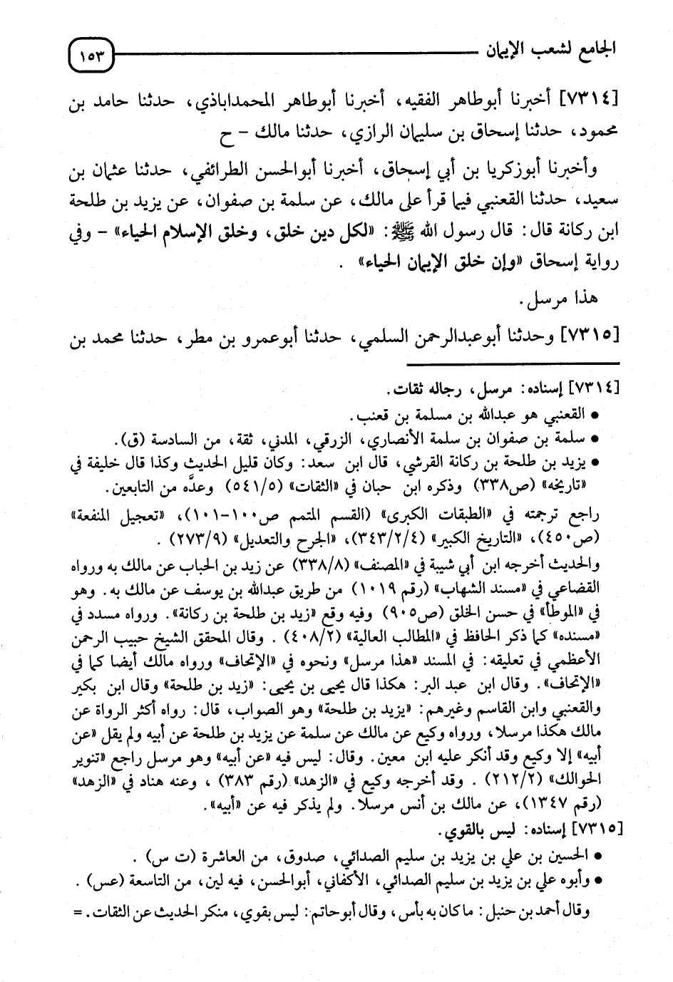 7314 - أَخْبَرَنَا أَبُو طَاهِرٍ الْفَقِيهُ، أنا أَبُو طَاهِرٍ الْمُحَمَّدْأَبَاذِيُّ، نا حَامِدُ بْنُ مَحْمُودٍ، نا إِسْحَاقُ بْنُ سُلَيْمَانَ الرَّازِيُّ، نا مَالِكٌ، ح وَأَخْبَرَنَا أَبُو زَكَرِيَّا بْنُ أَبِي إِسْحَاقَ، أنا أَبُو الْحَسَنِ الطَّرَائِفِيُّ، نا عُثْمَانُ بْنُ سَعِيدٍ، نا الْقَعْنَبِيُّ، فِيمَا قَرَأَ عَلَى مَالِكٍ، عَنْ سَلَمَةَ بْنِ صَفْوَانَ، عَنْ يَزِيدَ بْنِ طَلْحَةَ بْنِ رُكَانَةَ، قَالَ: قَالَ رَسُولُ اللهِ صَلَّى اللَّهُ عَلَيْهِ وَسَلَّمَ: " §لِكُلِّ دِينٍ خُلُقٌ، وَخُلُقُ الْإِسْلَامِ الْحَيَاءُ " وَفِي رِوَايَةِ إِسْحَاقَ: " وَإِنَّ خُلُقَ الْإِيمَانِ الْحَيَاءُ " هَذَا مُرْسَلٌ