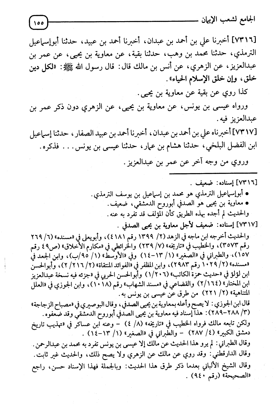7316 - أَخْبَرَنَا عَلِيُّ بْنُ أَحْمَدَ بْنِ عَبْدَانَ، أنا أَحْمَدُ بْنُ عُبَيْدٍ، نا أَبُو إِسْمَاعِيلَ التِّرْمِذِيُّ، نا مُحَمَّدُ بْنُ وَهْبٍ، نا بَقِيَّةُ، عَنْ مُعَاوِيَةَ بْنِ يَحْيَى، عَنْ عُمَرَ بْنِ عَبْدِ الْعَزِيزِ، عَنِ الزُّهْرِيِّ، عَنْ أَنَسِ بْنِ مَالِكٍ، قَالَ: قَالَ رَسُولُ اللهِ صَلَّى اللَّهُ عَلَيْهِ وَسَلَّمَ: " §لِكُلِّ دِينٍ خُلُقٌ، وَإِنَّ خُلُقَ الْإِسْلَامِ الْحَيَاءُ " كَذَا رُوِيَ عَنْ بَقِيَّةَ، عَنْ مُعَاوِيَةَ بْنِ يَحْيَى، وَرَوَاهُ عِيسَى بْنُ يُونُسَ، عَنْ مُعَاوِيَةَ بْنِ يَحْيَى، عَنِ الزُّهْرِيِّ دُونَ ذِكْرِ عُمَرَ بْنِ عَبْدِ الْعَزِيزِ فِيهِ،