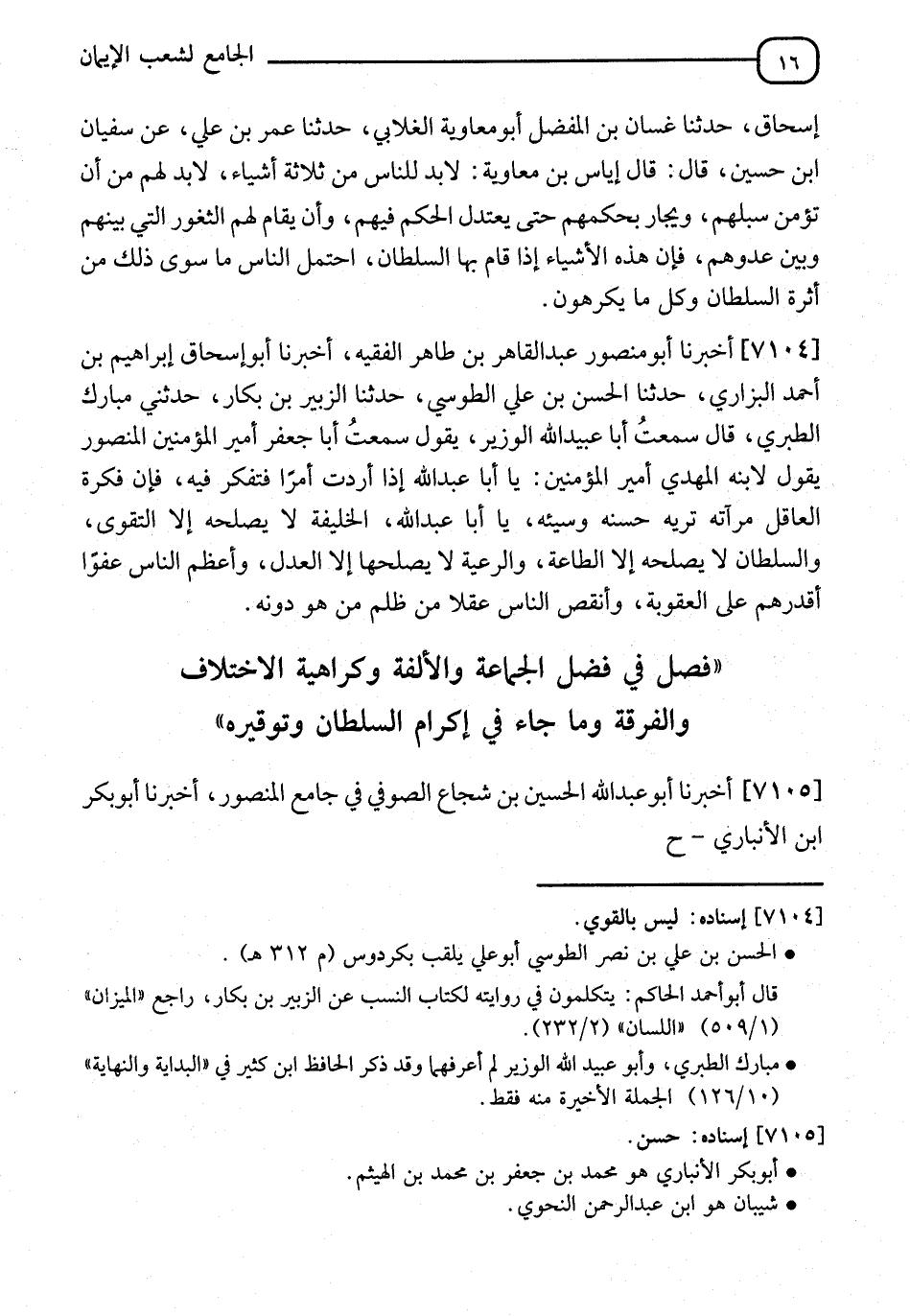 7104 - أَخْبَرَنَا أَبُو مَنْصُورٍ عَبْدُ الْقَاهِرِ بْنُ طَاهِرٍ الْفَقِيهُ، أنا أَبُو إِسْحَاقَ إِبْرَاهِيمُ بْنُ أَحْمَدَ الْبَرَارِيُّ، نا الْحَسَنُ بْنُ عَلِيٍّ الطُّوسِيُّ، نا الزُّبَيْرُ بْنُ بَكَّارٍ، حَدَّثَنِي مُبَارَكٌ الطَّبَرِيُّ، سَمِعْتُ أَبَا عُبَيْدِ اللهِ الْوَزِيرَ، سَمِعْتُ أَبَا جَعْفَرٍ، أَمِيرَ الْمُؤْمِنِينَ الْمَنْصُورَ يَقُولُ لِابْنِهِ الْمَهْدِيِّ أَمِيرِ الْمُؤْمِنِينَ: " يَا أَبَا عَبْدِ اللهِ، إِذَا أَرَدْتَ أَمْرًا فَفَكِّرْ فِيهِ، فَإِنَّ فِكْرَةَ الْعَاقِلِ مِرْآتُهُ تُرِيهِ حَسَنَهُ وَسَيِّئَهُ، يَا أَبَا عَبْدِ اللهِ، §الْخَلِيفَةُ لَا يُصْلِحُهُ إِلَّا التَّقْوَى، وَالسُّلْطَانُ لَا يُصْلِحُهُ إِلَّا الطَّاعَةُ، والرَّعِيَّةُ لَا يُصْلِحُهَا إِلَّا الْعَدْلُ، وَأَعْظَمُ النَّاسِ عَفْوًا أَقْدَرُهُمْ عَلَى الْعُقُوبَةِ، وَأَنْقَصُ النَّاسِ عَقْلًا مَنْ ظَلَمَ مَنْ هُوَ دُونَهُ "