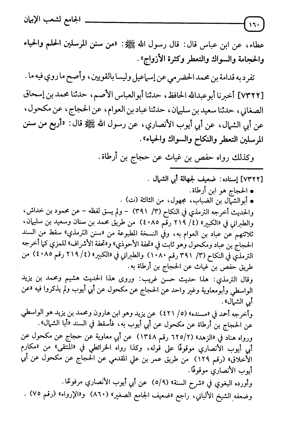7322 - أَخْبَرَنَا أَبُو عَبْدِ اللهِ الْحَافِظُ، نا أَبُو الْعَبَّاسِ الْأَصَمُّ، نا مُحَمَّدُ بْنُ إِسْحَاقَ الصَّغَانِيُّ، نا سَعِيدُ بْنُ سُلَيْمَانَ، نا عَبَّادُ بْنُ الْعَوَّامِ، عَنْ حَجَّاجٍ، عَنْ مَكْحُولٍ، عَنْ أَبِي الشِّمَالِ، عَنْ أَبِي أَيُّوبَ الْأَنْصَارِيِّ، عَنْ رَسُولِ اللهِ صَلَّى اللَّهُ عَلَيْهِ وَسَلَّمَ قَالَ: " §أَرْبَعٌ مِنْ سُنَنِ الْمُرْسَلِينَ: التَّعَطُّرُ، وَالنِّكَاحُ، وَالسِّوَاكُ، وَالْحَيَاءُ " وَكَذَلِكَ رَوَاهُ حَفْصُ بْنُ غِيَاثٍ، عَنْ حَجَّاجِ بْنِ أَرْطَأَةَ