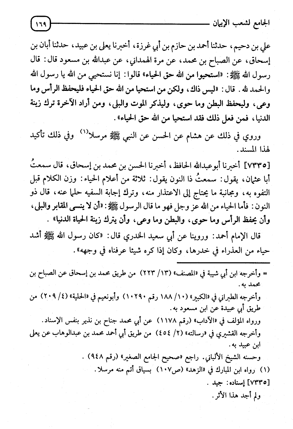 7335 - أَخْبَرَنَا أَبُو عَبْدِ اللهِ الْحَافِظُ، أنا الْحَسَنُ بْنُ مُحَمَّدِ بْنِ إِسْحَاقَ، قَالَ: سَمِعْتُ أَبَا عُثْمَانَ، يَقُولُ: سَمِعْتُ ذَا النُّونِ يَقُولُ: ثَلَاثَةٌ مِنْ أَعْلَامِ الْحَيَاءِ: وَزْنُ الْكَلَامِ قَبْلَ التَّفَوُّهِ بِهِ، وَمُجَانَبَةُ مَا يَحْتَاجُ إِلَى الِاعْتِذَارِ مِنْهُ، وَتَرْكُ إِجَابَةِ السَّفِيهِ حِلْمًا عَنْهُ، قَالَ ذُو النُّونِ: فَأَمَّا الْحَيَاءُ مِنَ اللهِ عَزَّ وَجَلَّ فَهُوَ مَا قَالَ الرَّسُولُ صَلَّى اللَّهُ عَلَيْهِ وَسَلَّمَ: " أَنْ §لَا تَنْسَى الْمَقَابِرَ وَالْبِلَى، وَأَنْ تَحْفَظَ الرَّأْسَ وَمَا حَوَى، وَالْبَطْنَ وَمَا وَعَى، وَأَنْ تَتْرُكَ زِينَةَ الْحَيَاةِ الدُّنْيَا "