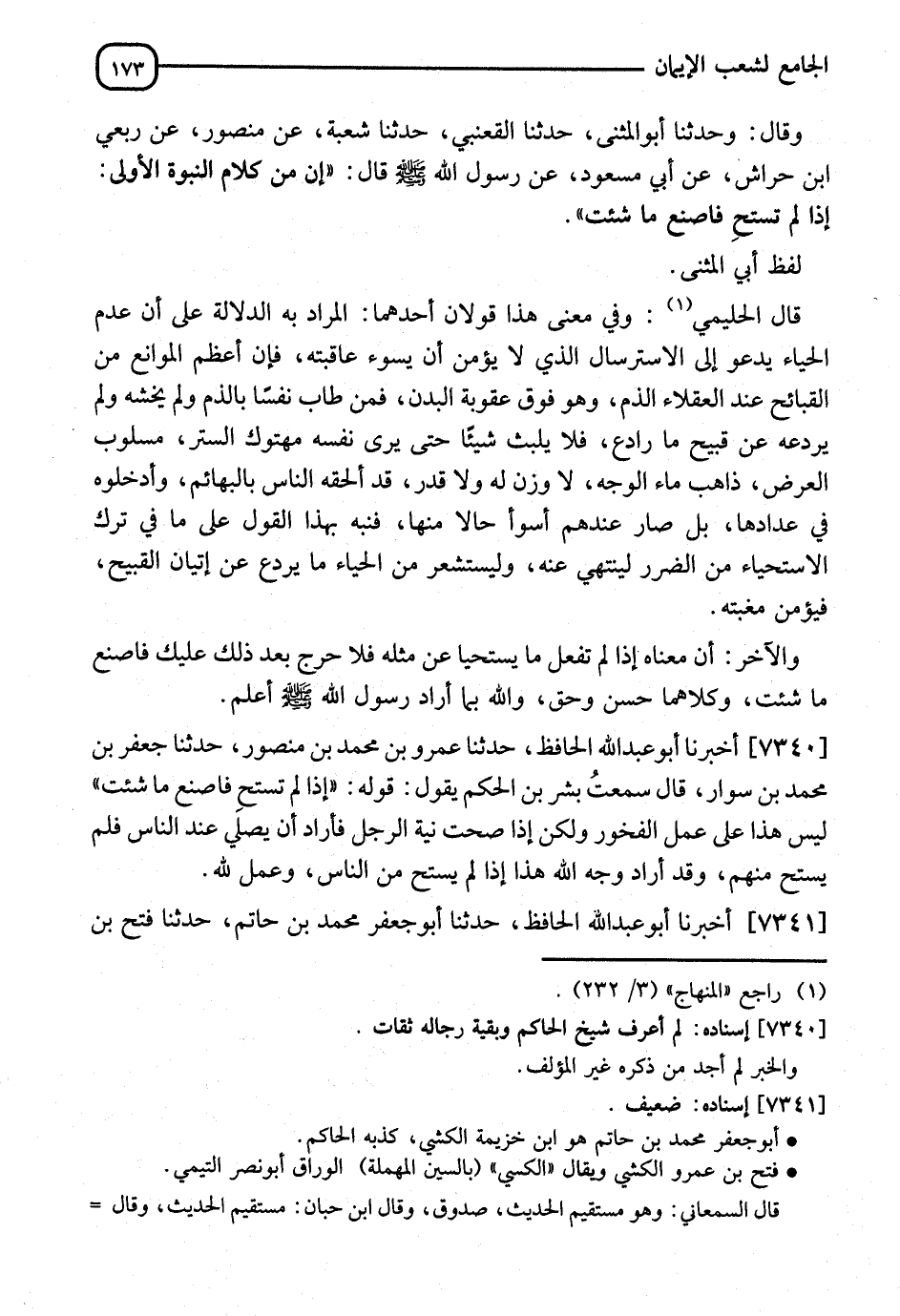 7340 - أَخْبَرَنَا أَبُو عَبْدِ اللهِ الْحَافِظُ، نا عَمْرُو بْنُ مُحَمَّدِ بْنِ مَنْصُورٍ، نا جَعْفَرُ بْنُ مُحَمَّدِ بْنِ سَوَّارٍ، قَالَ: سَمِعْتُ بِشْرَ بْنَ الْحَكَمِ، يَقُولُ: " قَوْلُهُ: §إِذَا لَمْ تَسْتَحِ فَاصْنَعْ مَا شِئْتَ، لَيْسَ هَذَا عَلَى عَمَلِ الْفُجُورِ، وَلَكِنْ إِذَا صَحَّتْ نِيَّةُ الرَّجُلِ فَأَرَادَ أَنْ يُصَلِّيَ عِنْدَ النَّاسِ فَلَمْ يَسْتَحِ مِنْهُمْ، وَقَدْ أَرَادَ وَجْهَ اللهِ، هَذَا إِذَا لَمْ يَسْتَحِ مِنَ النَّاسِ وَعَمِلَ لِلَّهِ "