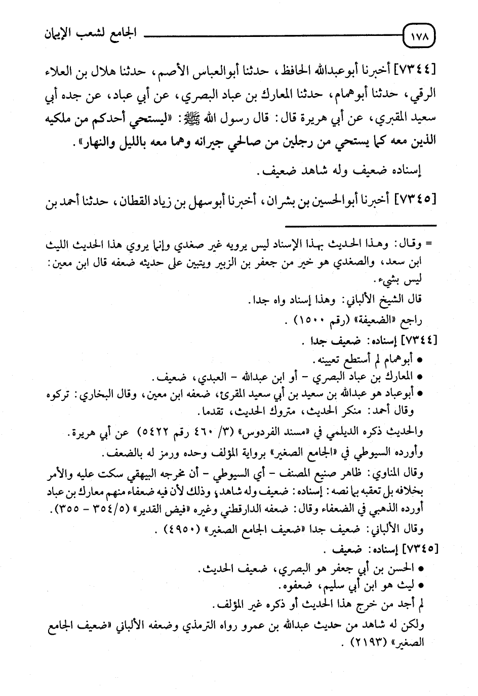 7344 - أَخْبَرَنَا أَبُو عَبْدِ اللهِ الْحَافِظُ، نا أَبُو الْعَبَّاسِ الْأَصَمُّ، نا هِلَالُ بْنُ الْعَلَاءِ الرَّقِّيُّ، نا أَبُو هَمَّامٍ، نا الْمُعَارِكُ بْنُ عَبَّادٍ الْبَصْرِيُّ، عَنْ أَبِي عَبَّادٍ، عَنْ جَدِّهِ أَبِي سَعِيدٍ الْمَقْبُرِيِّ، عَنْ أَبِي هُرَيْرَةَ، قَالَ: قَالَ رَسُولُ اللهِ صَلَّى اللَّهُ عَلَيْهِ وَسَلَّمَ: §" لَيَسْتَحِ أَحَدُكُمْ مِنْ مَلَكَيْهِ اللَّذَيْنِ مَعَهُ كَمَا يَسْتَحِي مِنْ رَجُلَيْنِ صَالِحَيْنِ مِنْ صَالِحِ جِيرَانِهِ، وَهُمَا مَعَهُ بِاللَّيْلِ وَالنَّهَارِ " إِسْنَادُهُ ضَعِيفٌ، وَلَهُ شَاهِدٌ ضَعِيفٌ