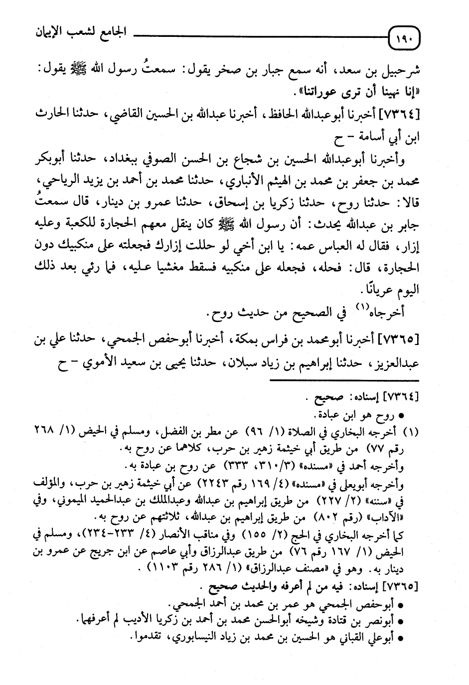 7364 - أَخْبَرَنَا أَبُو عَبْدِ اللهِ الْحَافِظُ، أنا عَبْدُ اللهِ بْنُ الْحُسَيْنِ الْقَاضِي، نا الْحَارِثُ بْنُ أَبِي أُسَامَةَ، ح وَأَخْبَرَنَا أَبُو عَبْدِ اللهِ الْحُسَيْنُ بْنُ شُجَاعِ بْنِ الْحُسَيْنِ الصُّوفِيُّ، بِبَغْدَادَ، أنا أَبُو بَكْرٍ مُحَمَّدُ بْنُ جَعْفَرِ بْنِ الْهَيْثَمِ الْأَنْبَارِيُّ، نا مُحَمَّدُ بْنُ أَحْمَدَ بْنِ يَزِيدَ الرِّيَاحِيُّ، قَالَا: نا رَوْحٌ، نا زَكَرِيَّا بْنُ إِسْحَاقَ، نا عَمْرُو بْنُ دِينَارٍ، قَالَ: سَمِعْتُ جَابِرَ بْنَ عَبْدِ اللهِ يُحَدِّثُ، " أَنَّ رَسُولَ اللهِ صَلَّى اللَّهُ عَلَيْهِ وَسَلَّمَ كَانَ §يَنْقِلُ مَعَهُمُ الْحِجَارَةَ لِلْكَعْبَةِ وَعَلَيْهِ إِزَارٌ " فَقَالَ لَهُ الْعَبَّاسُ عَمُّهُ: يَا ابْنَ أَخِي، لَوْ حَلَلْتُ لَكَ إِزَارَكَ فَجَعَلْتُهُ عَلَى مَنْكِبَيْكَ دُونَ الْحِجَارَةِ؟ قَالَ: فَحَلَّهُ فَجَعَلَهُ عَلَى مَنْكِبَيْهِ فَسَقَطَ مَغْشِيًّا عَلَيْهِ، فَمَا رُئِيَ بَعْدَ ذَلِكَ الْيَوْمِ عُرْيَانًا أَخْرَجَاهُ مِنْ حَدِيثِ رَوْحٍ