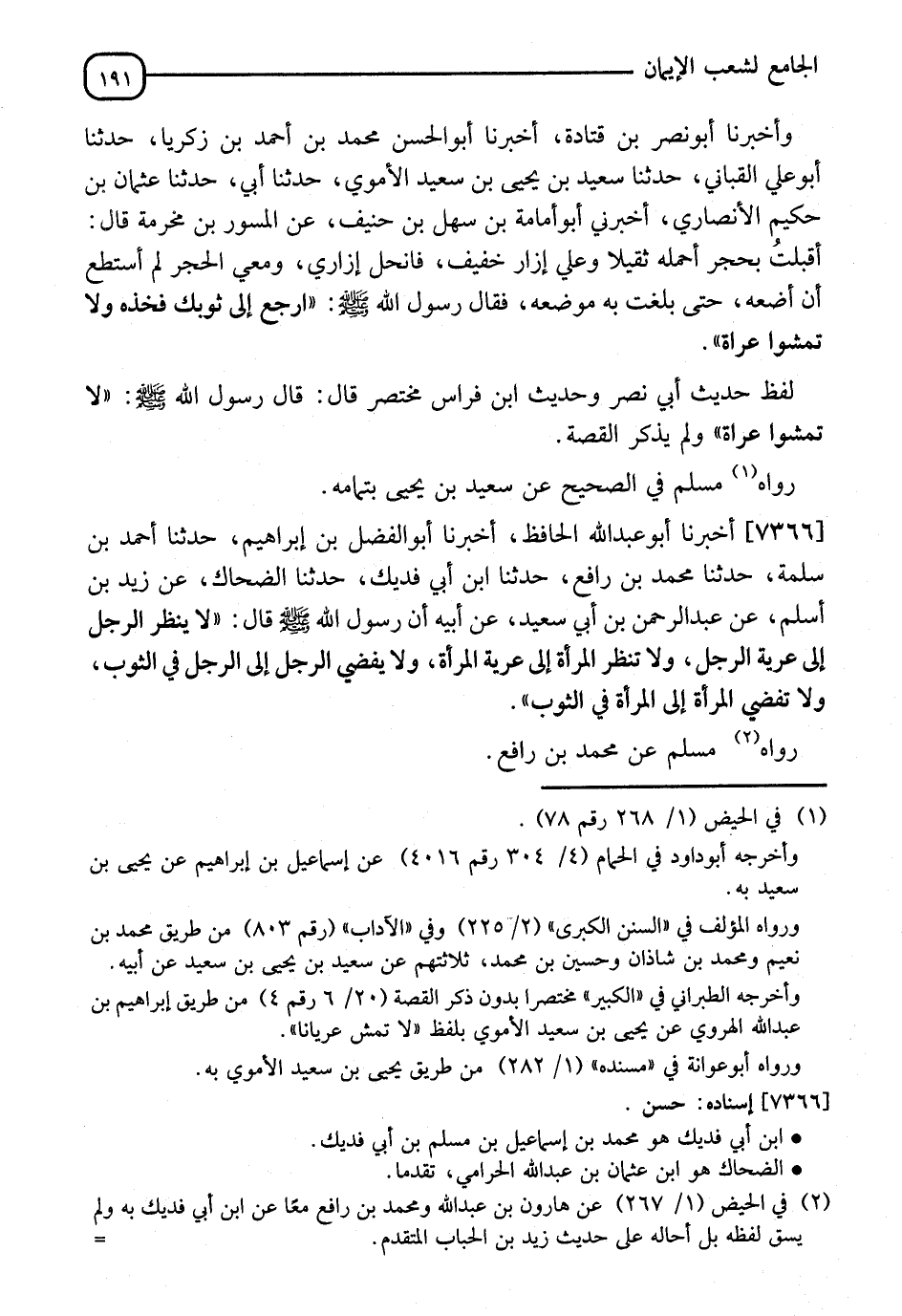 7366 - أَخْبَرَنَاهُ أَبُو عَبْدِ اللهِ الْحَافِظُ، نا أَبُو الْفَضْلِ بْنُ إِبْرَاهِيمَ، نا أَحْمَدُ بْنُ سَلَمَةَ، نا مُحَمَّدُ بْنُ رَافِعٍ، نا ابْنُ أَبِي فُدَيْكٍ، نا الضَّحَّاكُ، عَنْ زَيْدِ بْنِ أَسْلِمَ، عَنْ عَبْدِ الرَّحْمَنِ بْنِ أَبِي سَعِيدٍ، عَنْ أَبِيهِ، أَنَّ رَسُولَ اللهِ صَلَّى اللَّهُ عَلَيْهِ وَسَلَّمَ قَالَ: " §لَا يَنْظُرِ الرَّجُلُ إِلَى عَوْرَةِ الرَّجُلِ، وَلَا تَنْظُرِ الْمَرْأَةُ إِلَى عَوْرَةِ الْمَرْأَةِ، وَلَا يُفْضِي الرَّجُلُ إِلَى الرَّجُلِ فِي الثَّوْبِ، وَلَا تُفْضِي الْمَرْأَةُ إِلَى الْمَرْأَةِ فِي الثَّوْبِ " رَوَاهُ مُسْلِمٌ، عَنْ مُحَمَّدِ بْنِ رَافِعٍ