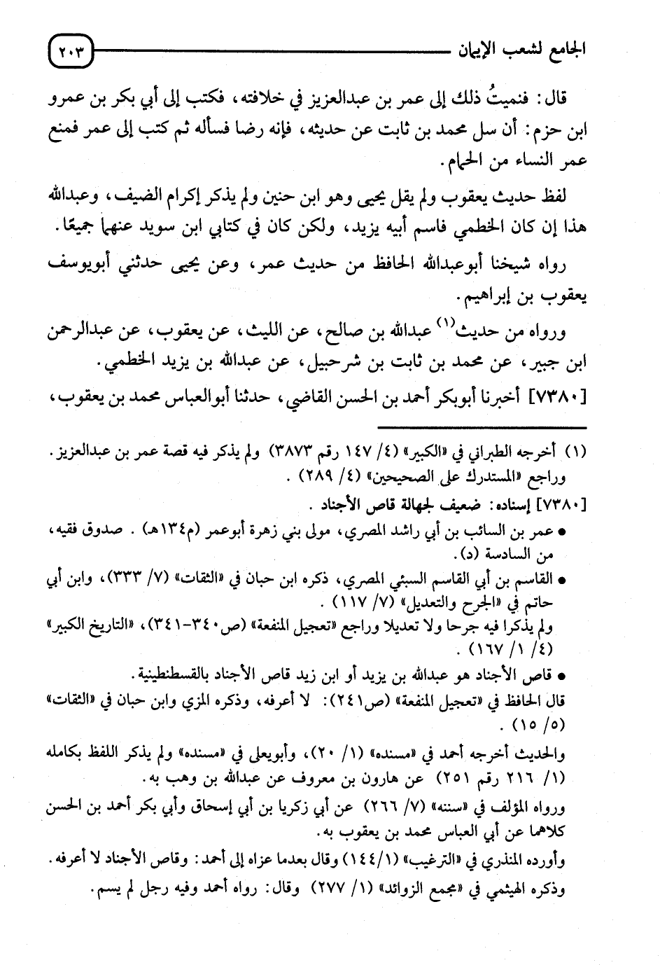 7380 - أَخْبَرَنَا أَبُو بَكْرٍ أَحْمَدُ بْنُ الْحَسَنِ الْقَاضِي، نا أَبُو الْعَبَّاسِ مُحَمَّدُ بْنُ يَعْقُوبَ، -[204]- نا مُحَمَّدُ بْنُ عَبْدِ اللهِ بْنِ عَبْدِ الْحَكَمِ، أنا ابْنُ وَهْبٍ، حَدَّثَنِي عَمْرُو بْنُ الْحَارِثِ، أَنَّ عُمَرَ بْنَ السَّائِبِ حَدَّثَهُ، أَنَّ الْقَاسِمَ بْنَ أَبِي الْقَاسِمِ حَدَّثَهُ، أَنَّهُ سَمِعَ قَاصَّ الْأَجْنَادِ، بِالْقُسْطَنْطِينِيَّةِ يُحَدِّثُ: عَنْ عُمَرَ بْنِ الْخَطَّابِ أَنَّهُ قَالَ: أَيُّهَا النَّاسُ، إِنِّي سَمِعْتُ رَسُولَ اللهِ صَلَّى اللَّهُ عَلَيْهِ وَسَلَّمَ يَقُولُ: §" مَنْ كَانَ يُؤْمِنُ بِاللهِ وَالْيَوْمِ الْآخِرِ فَلَا يَقْعُدْ عَلَى مَائِدَةٍ يُدَارُ عَلَيْهَا الْخَمْرُ، وَمَنْ كَانَ يُؤْمِنُ بِاللهِ وَالْيَوْمِ الْآخِرِ فَلَا يَدْخُلِ الْحَمَّامَ إِلَّا بِإِزَارٍ، وَمَنْ كَانَتْ تُؤْمِنُ بِاللهِ وَالْيَوْمِ الْآخِرِ فَلَا تَدْخُلِ الْحَمَّامَ "