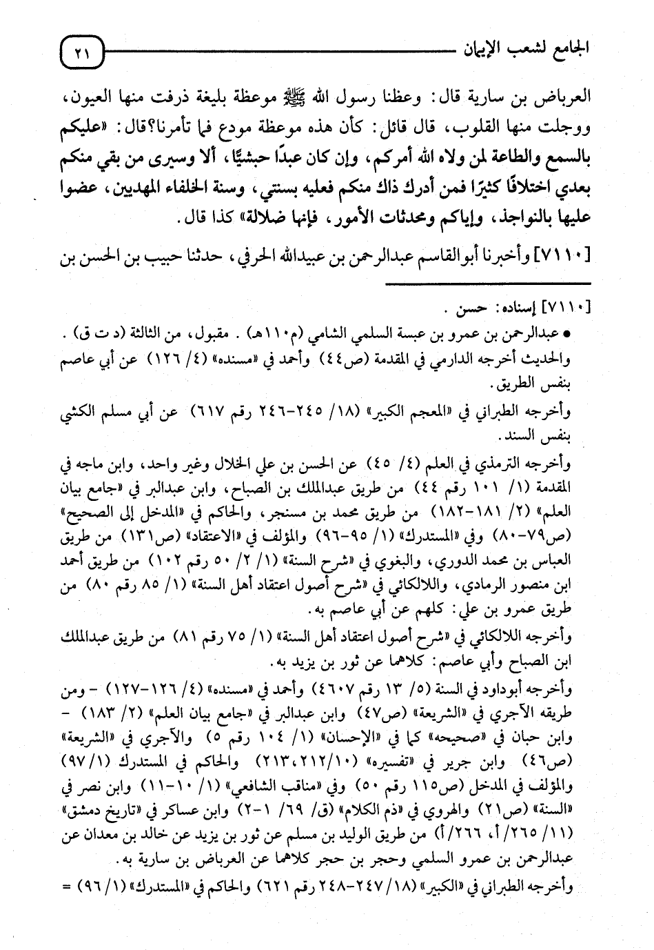 7110 - وَأَخْبَرَنَا أَبُو الْقَاسِمِ بْنُ عَبْدِ الرَّحْمَنِ بْنِ عَبْدِ اللهِ الْخَرْقِيُّ، نا حَبِيبُ بْنُ الْحَسَنِ بْنِ -[22]- دَاوُدَ الْقَزَّازُ، إِمْلَاءً، نا إِبْرَاهِيمُ بْنُ عَبْدِ اللهِ بْنِ مُسْلِمٍ الْبَصْرِيُّ، نا أَبُو عَاصِمٍ الضَّحَّاكُ بْنُ مَخْلَدٍ، عَنْ ثَوْرٍ يَعْنِي ابْنَ يَزِيدَ، عَنْ خَالِدِ بْنِ مَعْدَانَ، عَنْ عَبْدِ الرَّحْمَنِ بْنِ عَمْرٍو السُّلَمِيِّ، عَنِ الْعِرْبَاضِ بْنِ سَارِيَةَ، أَنَّهُ قَالَ: صَلَّى لَنَا رَسُولُ اللهِ صَلَّى اللَّهُ عَلَيْهِ وَسَلَّمَ صَلَاةَ الصُّبْحِ، ثُمَّ أَقْبَلَ عَلَيْنَا بِوَجْهِهِ وَوَعَظَنَا بِمَوْعِظَةٍ بَلِيغَةٍ ذَرَفَتْ مِنْهَا الْأَعْيُنُ وَوَجِلَتْ مِنْهَا الْقُلُوبُ، فَقَالَ قَائِلٌ: يَا رَسُولَ اللهِ، كَأَنَّهَا مَوْعِظَةُ مُوَدَّعٍ فَأَوْصِنَا، قَالَ: " §أُوصِيكُمْ بِتَقْوَى اللهِ، وَالسَّمْعِ وَالطَّاعَةِ، وَإِنْ كَانَ عَبْدًا حَبَشِيًّا، فَإِنَّهُ مَنْ يَعِشْ مِنْكُمْ فَسَيَرَى اخْتِلَافًا كَثِيرًا، فَعَلَيْكُمْ بِسُنَّتِي وَسُنَّةِ الْخُلَفَاءِ الرَّاشِدِينَ الْمَهْدِيِّينَ، وَعَضُّوا عَلَيْهَا بِالنَّوَاجِذِ، وَإِيَّاكُمْ وَمُحْدَثَاتِ الْأُمُورِ، فَإِنَّ كُلَّ بِدْعَةٍ ضَلَالَةٌ "