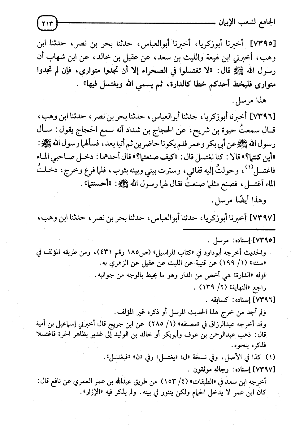 7395 - أَخْبَرَنَا أَبُو زَكَرِيَّا، نا أَبُو الْعَبَّاسِ، نا بَحْرُ بْنُ نَصْرٍ، نا ابْنُ وَهْبٍ، أَخْبَرَنِي ابْنُ لَهِيعَةَ، وَاللَّيْثُ بْنُ سَعْدٍ، عَنْ عُقَيْلِ بْنِ خَالِدٍ، عَنِ ابْنِ شِهَابٍ، أَنَّ رَسُولَ اللهِ صَلَّى اللَّهُ عَلَيْهِ وَسَلَّمَ قَالَ: " §لَا تَغْتَسِلُوا فِي الصَّحْرَاءِ، إِلَّا أَنْ تَجِدُوا مُتَوَارًى، فَإِنْ لَمْ تَجِدُوا مُتَوَارًى فَلْيَخُطَّ أَحَدُكُمْ خَطًّا كَالدَّائِرَةِ، ثُمَّ يُسَمِّي اللهَ وَيَغْتَسِلُ فِيهَا " هَذَا مُرْسَلٌ
