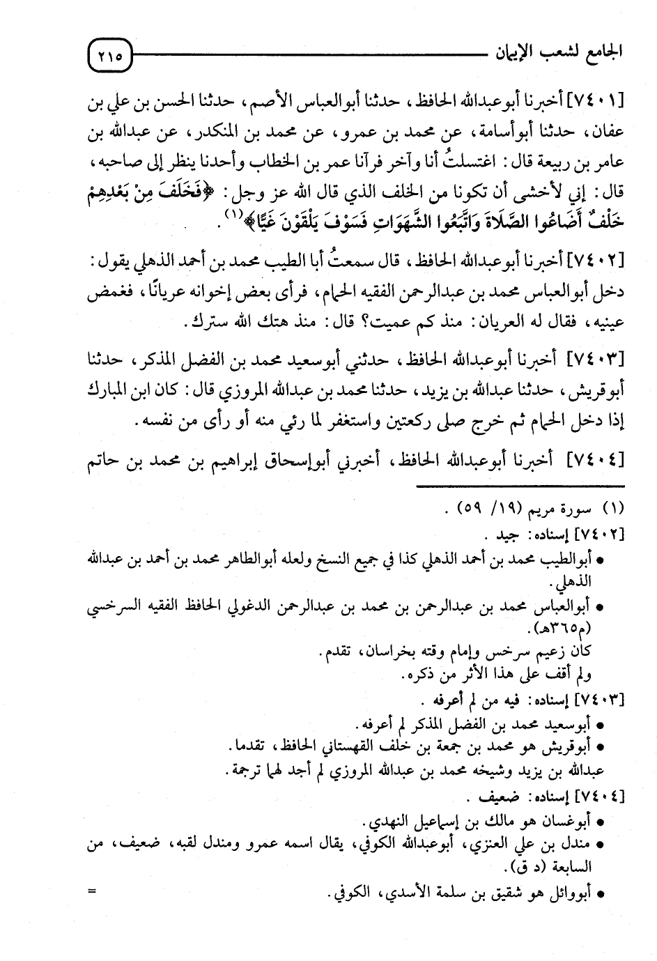 7401 - أَخْبَرَنَا أَبُو عَبْدِ اللهِ الْحَافِظُ، نا أَبُو الْعَبَّاسِ الْأَصَمُّ، نا الْحَسَنُ بْنُ عَلِيِّ بْنِ عَفَّانَ، نا أَبُو أُسَامَةَ، عَنْ مُحَمَّدِ بْنِ عَمْرٍو، عَنْ مُحَمَّدِ بْنِ الْمُنْكَدِرِ، عَنْ عَبْدِ اللهِ بْنِ عَامِرِ بْنِ رَبِيعَةَ، قَالَ: اغْتَسَلْتُ أَنَا وَآخَرُ، فَرَآنَا عُمَرُ بْنُ الْخَطَّابِ، وَأَحَدُنَا يَنْظُرُ إِلَى صَاحِبِهِ، قَالَ: " إِنِّي §لَأَخْشَى أَنْ يَكُونَا مِنَ الْخَلْفِ الَّذِي قَالَ اللهُ عَزَّ وَجَلَّ {فَخَلَفَ مِنْ بَعْدِهِمْ خَلْفٌ أَضَاعُوا الصَّلَاةَ وَاتَّبَعُوا الشَّهَوَاتِ فَسَوْفَ يَلْقَوْنَ غَيًّا} [مريم: 59] "