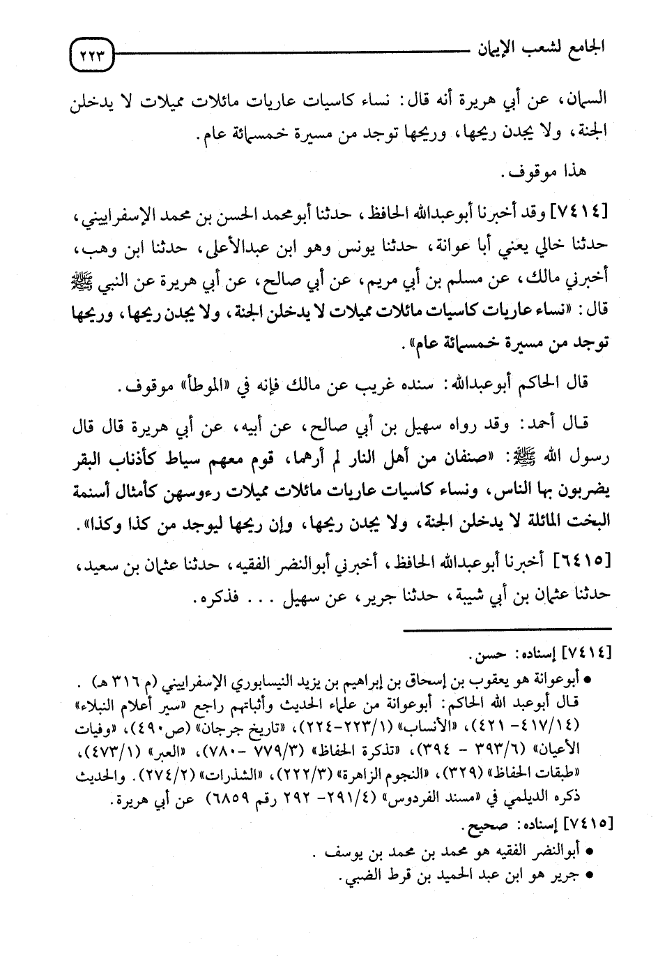 7414 - أَخْبَرَنَا أَبُو عَبْدِ اللهِ الْحَافِظُ، نا أَبُو مُحَمَّدٍ الْحَسَنُ بْنُ مُحَمَّدٍ الْإِسْفَرَايِنِيُّ، نا خَالِي يَعْنِي أَبَا عَوَانَةَ، نا يُونُسُ بْنُ عَبْدِ الْأَعْلَى، نا ابْنُ وَهْبٍ، أَخْبَرَنِي مَالِكٌ، عَنْ مُسْلِمِ بْنِ أَبِي مَرْيَمَ، عَنْ أَبِي هُرَيْرَةَ، عَنِ النَّبِيِّ صَلَّى اللَّهُ عَلَيْهِ وَسَلَّمَ قَالَ: " §نِسَاءٌ كَاسِيَاتٌ عَارِيَاتٌ مُتَمَيِّلَاتٌ، لَا يَدْخُلْنَ الْجَنَّةَ، وَلَا يَجِدْنَ رِيحَهَا، وَرِيحُهَا تُوجَدُ مِنْ مَسِيرَةِ خَمْسِ مِائَةِ عَامٍ " قَالَ الْحَاكِمُ أَبُو عَبْدِ اللهِ: " سَنَدُهُ غَرِيبٌ، عَنْ مَالِكٍ، فَإِنَّهُ فِي الْمُوَطَّأِ مَوْقُوفٌ "