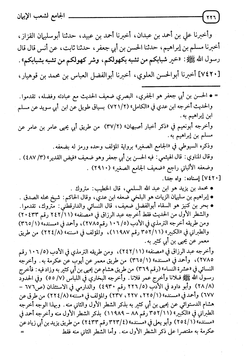 7420 - أَخْبَرَنَا أَبُو الْحَسَنِ الْعَلَوِيُّ، أنا أَبُو الْفَضْلِ الْعَبَّاسُ بْنُ مُحَمَّدِ بْنِ قُوهْيَارَ، -[227]- نا مُحَمَّدُ بْنُ يَزِيدَ، نا إِبْرَاهِيمُ بْنُ سُلَيْمَانَ الزَّيَّاتُ، نا بَحْرُ بْنُ كَثِيرٍ، عَنْ يَحْيَى بْنِ أَبِي كَثِيرٍ، عَنْ عِكْرِمَةَ، عَنِ ابْنِ عَبَّاسٍ، قَالَ: §لَعَنَ رَسُولُ اللهِ صَلَّى اللَّهُ عَلَيْهِ وَسَلَّمَ الْمُخَنَّثِينَ مِنَ الرِّجَالِ، والْمُذَكَّرَاتِ مِنَ النِّسَاءِ، قَالَ: " أَخْرِجُوهُمْ مِنَ الْبُيُوتِ "