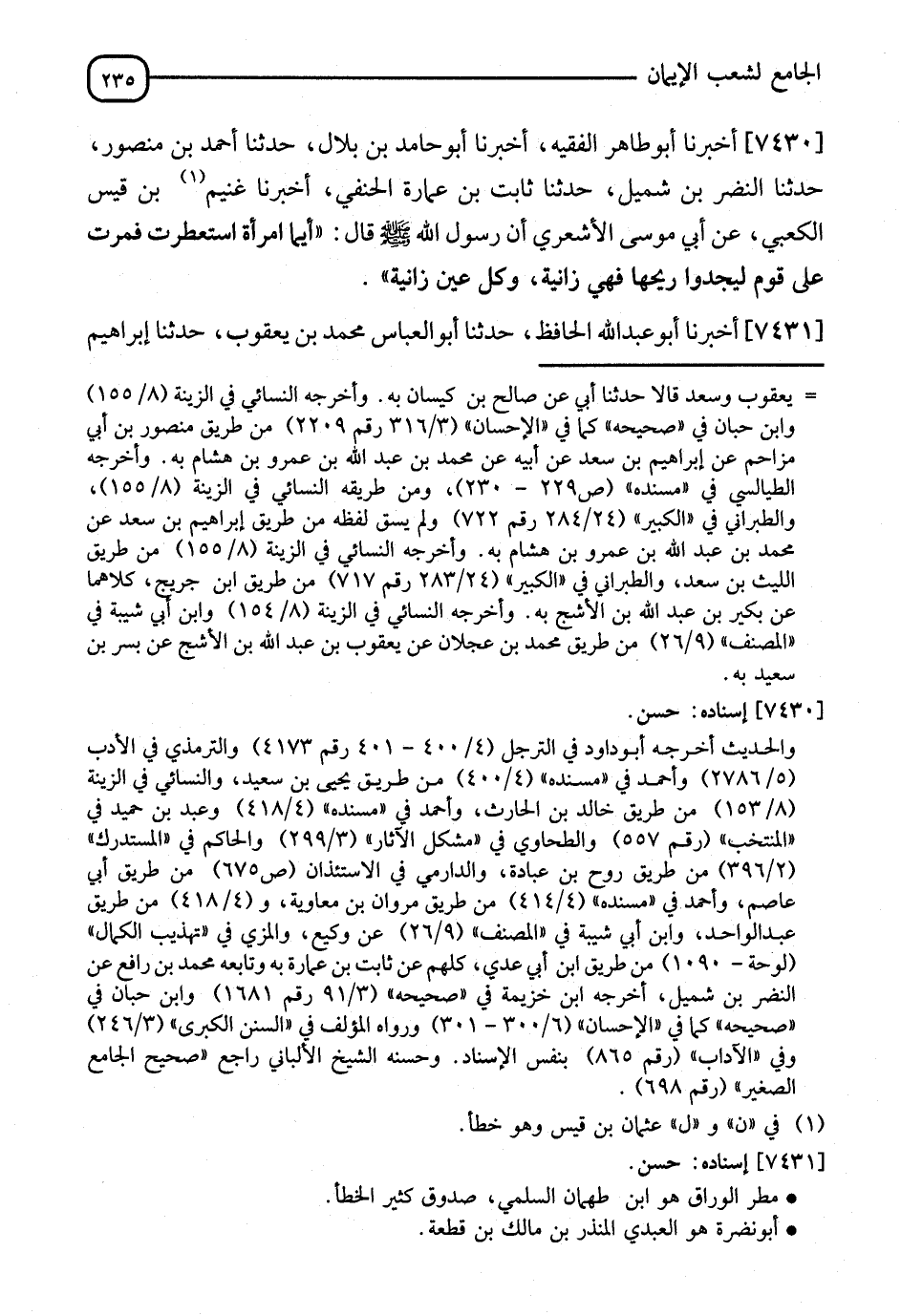 7430 - أَخْبَرَنَا أَبُو طَاهِرٍ الْفَقِيهُ، أنا أَبُو حَامِدِ بْنُ بِلَالٍ، نا أَحْمَدُ بْنُ مَنْصُورٍ، نا النَّضْرُ بْنُ شُمَيْلٍ، نا ثَابِتُ بْنُ عُمَارَةَ الْحَنَفِيُّ، نا غُنَيْمُ بْنُ قَيْسٍ الْكَعْبِيُّ، عَنْ أَبِي مُوسَى الْأَشْعَرِيِّ، أَنَّ رَسُولَ اللهِ صَلَّى اللَّهُ عَلَيْهِ وَسَلَّمَ قَالَ: §" أَيُّمَا امْرَأَةٍ اسْتَعْطَرَتْ فَمَرَّتْ عَلَى قَوْمٍ لِيَجِدُوا رِيحَهَا فَهِيَ زَانِيَةٌ، وَكُلُّ عَيْنٍ زَانِيَةٌ "