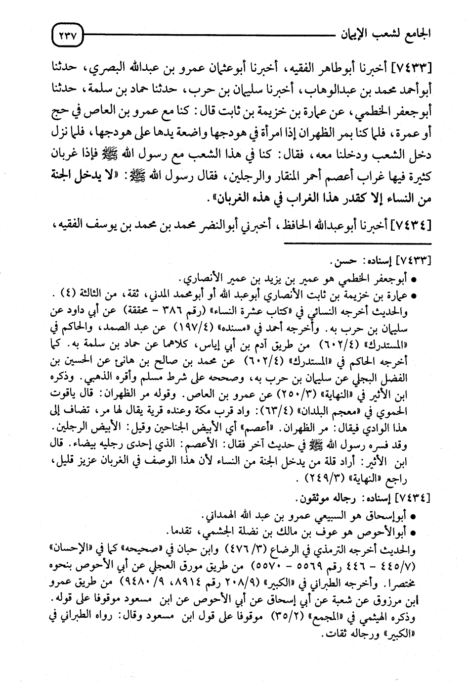 7433 - أَخْبَرَنَا أَبُو طَاهِرٍ الْفَقِيهُ، نا أَبُو عُثْمَانَ عَمْرُو بْنُ عَبْدِ اللهِ الْبَصْرِيِّ، نا أَبُو أَحْمَدَ مُحَمَّدُ بْنُ عَبْدِ الْوَهَّابِ، أنا سُلَيْمَانُ بْنُ حَرْبٍ، نا حَمَّادُ بْنُ سَلَمَةَ، نا أَبُو جَعْفَرٍ الْخَطْمِيُّ، عَنْ عُمَارَةَ بْنِ خُزَيْمَةَ بْنِ ثَابِتٍ، قَالَ: كُنَّا مَعَ عَمْرِو بْنِ الْعَاصِ فِي حَجٍّ أَوْ عُمْرَةٍ، فَلَمَّا كُنَّا بِمَرِّ الظَّهْرَانِ إِذَا امْرَأَةٌ فِي هَوْدَجِهَا وَاضِعَةٌ يَدَهَا عَلَى هَوْدَجِهَا، فَلَمَّا نَزَلَ دَخَلَ الشِّعْبَ وَدَخَلْنَا مَعَهُ، فَقَالَ: كُنَّا فِي هَذِهِ الشِّعْبِ مَعَ رَسُولِ اللهِ صَلَّى اللَّهُ عَلَيْهِ وَسَلَّمَ وَإِذَا غِرْبَانٌ كَثِيرَةٌ، فِيهَا غُرَابٌ أَعْصَمُ، أَحْمَرُ الْمِنْقَارِ وَالرِّجْلَيْنِ، فَقَالَ: رَسُولُ اللهِ صَلَّى اللَّهُ عَلَيْهِ وَسَلَّمَ: §" لَا يَدْخُلُ الْجَنَّةَ مِنَ النِّسَاءِ إِلَّا كَقَدْرِ هَذَا الْغُرَابِ فِي هَذِهِ الْغِرْبَانِ "
