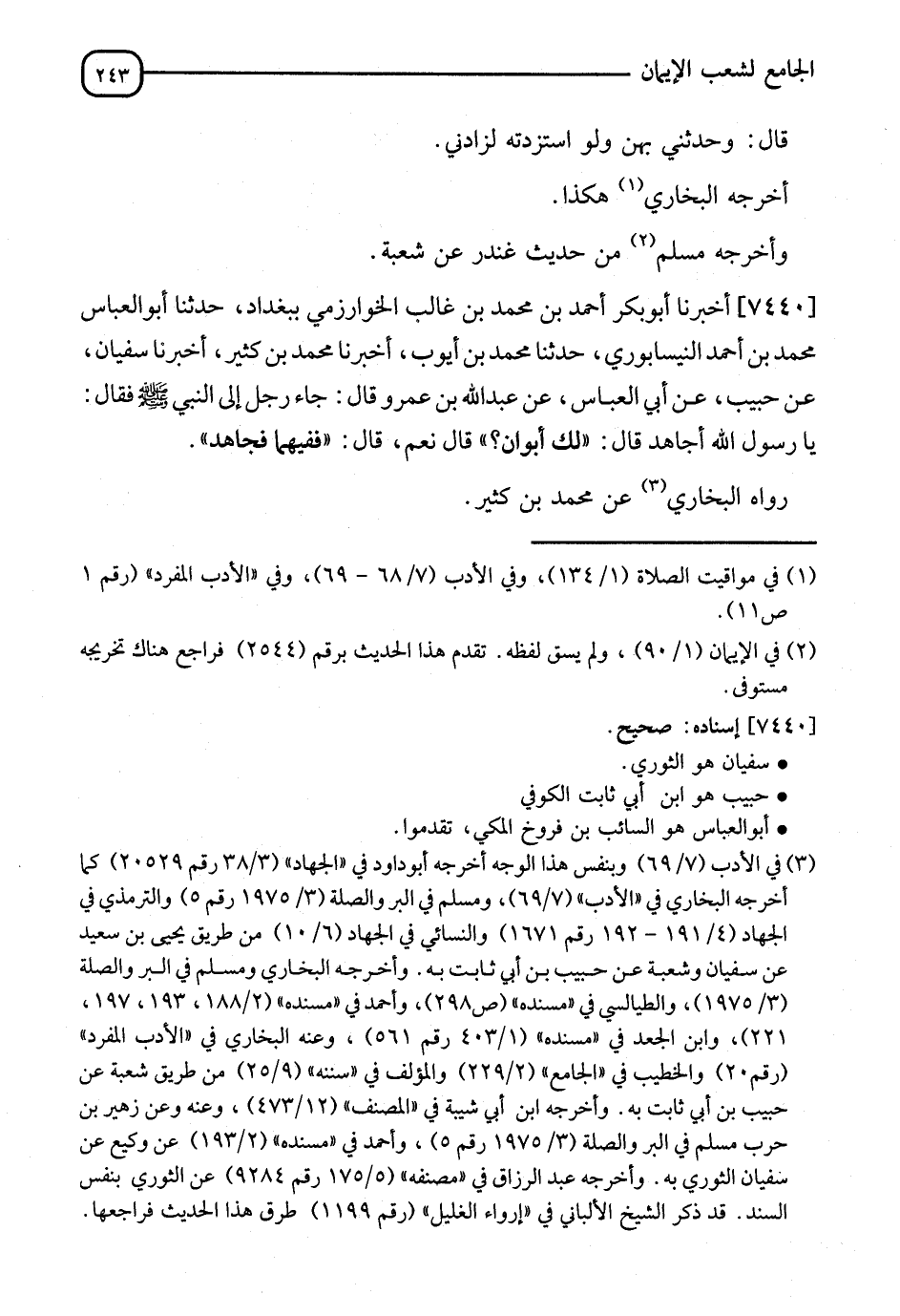 7440 - أَخْبَرَنَا أَبُو بَكْرٍ أَحْمَدُ بْنُ مُحَمَّدِ بْنِ غَالِبٍ الْخُوَارِزْمِيُّ بِبَغْدَادَ، نا أَبُو الْعَبَّاسِ مُحَمَّدُ بْنُ أَحْمَدَ النَّيْسَابُورِيُّ، نا مُحَمَّدُ بْنُ أَيُّوبَ، أنا مُحَمَّدُ بْنُ كَثِيرٍ، أنا سُفْيَانُ، عَنْ حَبِيبٍ، عَنْ أَبِي الْعَبَّاسِ، عَنْ عَبْدِ اللهِ بْنِ عَمْرٍو، قَالَ: أَتَى رَجُلٌ إِلَى النَّبِيِّ صَلَّى اللَّهُ عَلَيْهِ وَسَلَّمَ، فَقَالَ: يَا رَسُولَ اللهِ، أُجَاهِدُ؟ قَالَ: " §لَكَ أَبَوَانِ؟ " قَالَ: نَعَمْ، قَالَ: " فَفِيهِمَا فَجَاهِدْ " رَوَاهُ الْبُخَارِيُّ، عَنْ مُحَمَّدِ بْنِ كَثِيرٍ