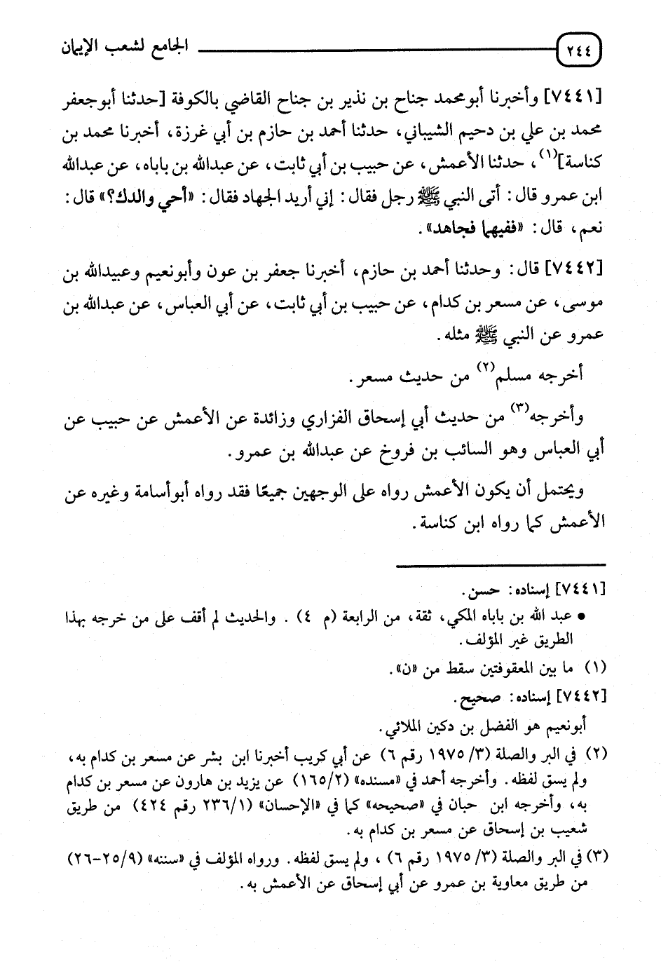 7441 - وَأَخْبَرَنَا أَبُو مُحَمَّدٍ جَنَاحُ بْنُ نَذِيرِ بْنِ جَنَاحٍ الْقَاضِي بِالْكُوفَةِ، نا أَبُو جَعْفَرٍ مُحَمَّدُ بْنُ عَلِيِّ بْنِ دُحَيْمٍ الشَّيْبَانِيُّ، نا أَحْمَدُ بْنُ حَازِمِ بْنِ أَبِي غَرَزَةَ، أنا مُحَمَّدُ بْنُ كُنَاسَةَ، نا الْأَعْمَشُ، عَنْ حَبِيبِ بْنِ أَبِي ثَابِتٍ، عَنْ عَبْدِ اللهِ بْنِ بَابَاهُ، عَنْ عَبْدِ اللهِ بْنِ عَمْرٍو، قَالَ: أَتَى النَّبِيَّ صَلَّى اللَّهُ عَلَيْهِ وَسَلَّمَ رَجُلٌ فَقَالَ: إِنِّي أُرِيدُ الْجِهَادَ، فَقَالَ: " §أَحَيٌّ وَالِدَاكَ؟ " قَالَ: نَعَمْ، قَالَ: " فَفِيهِمَا فَجَاهِدْ "