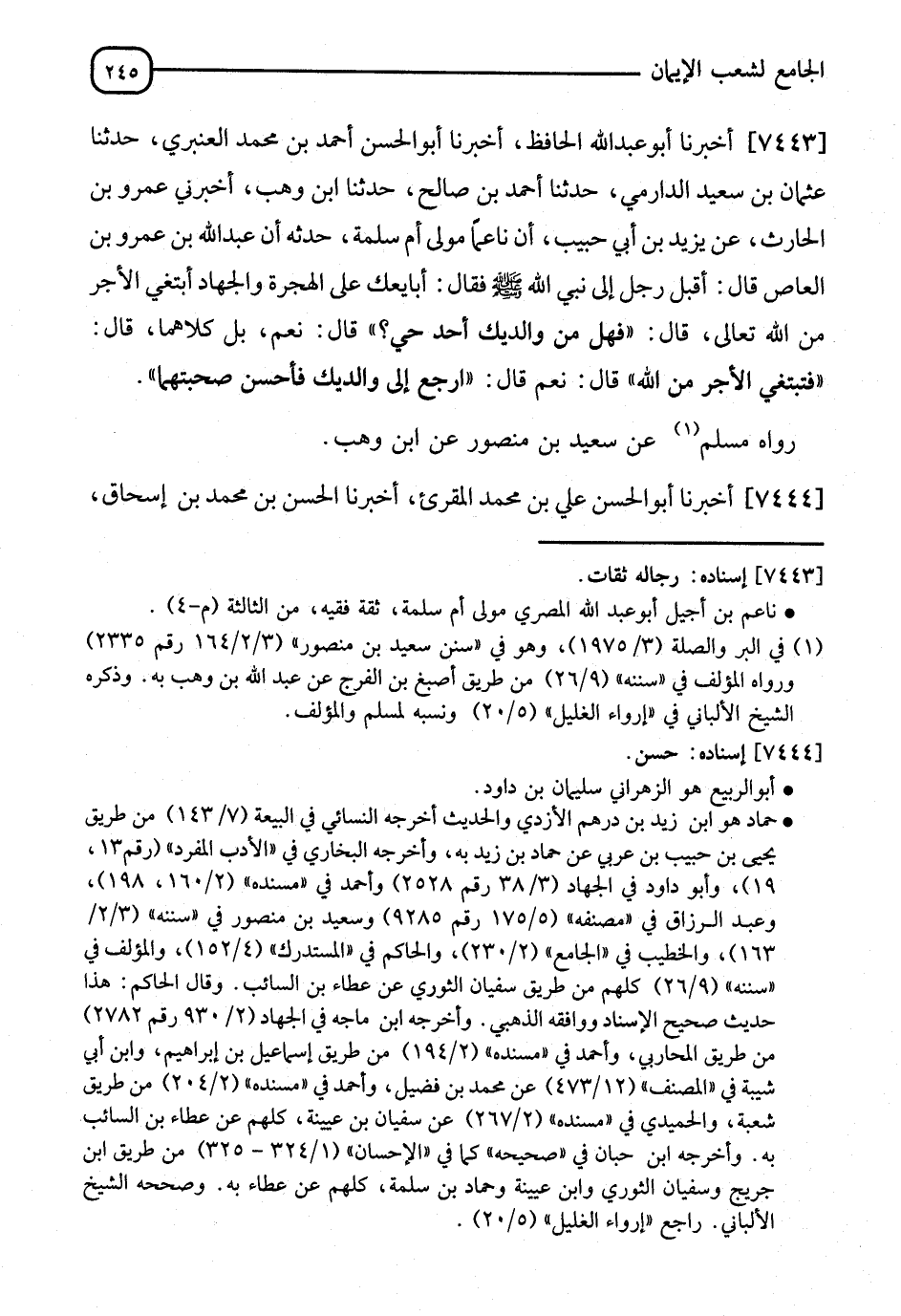 7443 - أَخْبَرَنَا أَبُو عَبْدِ اللهِ الْحَافِظُ، نا أَبُو الْحَسَنِ أَحْمَدُ بْنُ مُحَمَّدٍ الْعَنْبَرِيُّ، نا عُثْمَانُ بْنُ سَعِيدٍ الدَّارِمِيُّ، نا أَحْمَدُ بْنُ صَالِحٍ، نا ابْنُ وَهْبٍ، أَخْبَرَنِي عَمْرُو بْنُ الْحَارِثِ، عَنْ يَزِيدَ بْنِ أَبِي حَبِيبٍ، أَنَّ نَاعِمًا، مَوْلَى أُمِّ سَلَمَةَ، حَدَّثَهُ أَنَّ عَبْدَ اللهِ بْنَ عَمْرِو بْنِ الْعَاصِ، قَالَ: أَقْبَلَ رَجُلٌ إِلَى نَبِيِّ اللهِ صَلَّى اللَّهُ عَلَيْهِ وَسَلَّمَ فَقَالَ: أُبَايِعُكَ عَلَى الْهِجْرَةِ وَالْجِهَادِ، وَأَبْتَغِي الْأَجْرَ مِنَ اللهِ، قَالَ: " فَهَلْ مِنْ وَالِدَيْكَ أَحَدٌ حَيٌّ؟ " قَالَ: نَعَمْ، بَلْ كِلَاهُمَا، قَالَ: " تَبْتَغِي الْأَجْرَ مِنَ اللهِ؟ " قَالَ: نَعَمْ، قَالَ: " §ارْجِعْ إِلَى وَالِدَيْكَ، فَأَحْسِنْ صُحْبَتَهُمَا " رَوَاهُ مُسْلِمٌ، عَنْ سَعِيدِ بْنِ مَنْصُورٍ، عَنِ ابْنِ وَهْبٍ