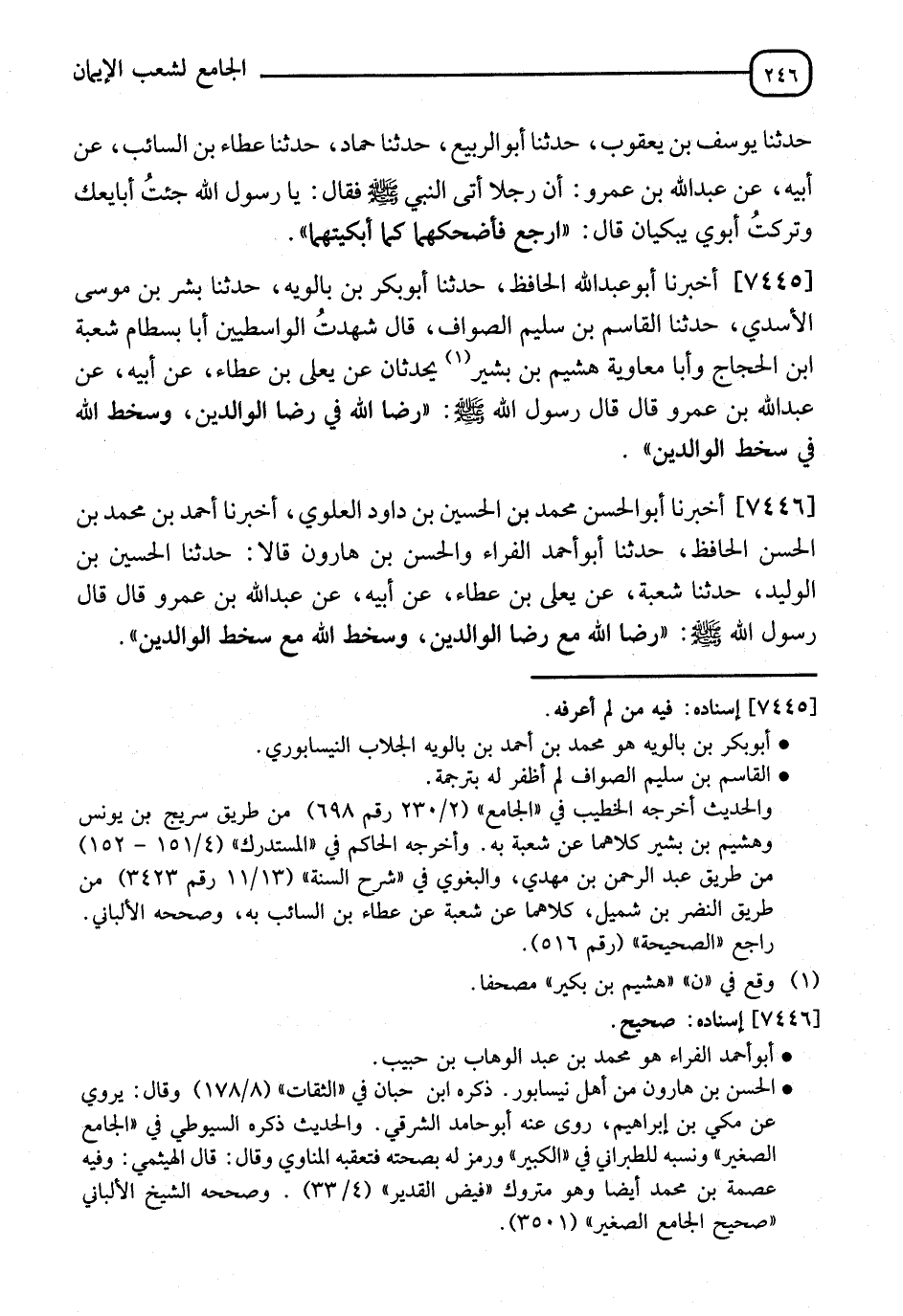 7445 - أَخْبَرَنَا أَبُو عَبْدِ اللهِ الْحَافِظُ، نا أَبُو بَكْرِ بْنُ بَالَوَيْهِ، نا بِشْرُ بْنُ مُوسَى الْأَسَدِيُّ، نا الْقَاسِمُ بْنُ سُلَيْمٍ الصَّوَّافُ، قَالَ: شَهِدْتُ الْوَاسِطِيَّيْنِ أَبَا بِسْطَامٍ شُعْبَةَ بْنَ الْحَجَّاجِ، وَأَبَا مُعَاوِيَةَ هُشَيْمَ بْنَ بَشِيرٍ يُحَدِّثَانِ، عَنْ يَعْلَى بْنِ عَطَاءٍ، عَنْ أَبِيهِ، عَنْ عَبْدِ اللهِ بْنِ عَمْرٍو، قَالَ: قَالَ رَسُولُ اللهِ صَلَّى اللَّهُ عَلَيْهِ وَسَلَّمَ: " §رِضَا اللهِ مِنْ رِضَا الْوَالِدَيْنِ، وَسَخَطُ اللهِ مِنْ سَخَطِ الْوَالِدَيْنِ "