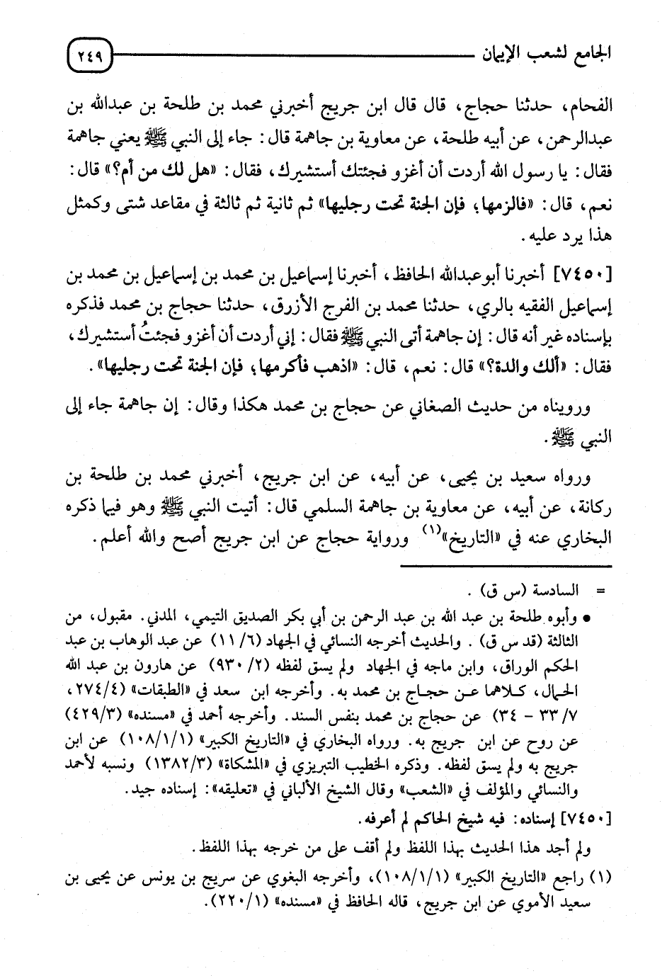 7450 - أَخْبَرَنَا أَبُو عَبْدِ اللهِ الْحَافِظُ، أنا إِسْمَاعِيلُ بْنُ مُحَمَّدِ بْنِ إِسْمَاعِيلَ الْفَقِيهُ، بِالرِّيِّ، نا مُحَمَّدُ بْنُ الْفَرَحِ الْأَزْرَقُ، نا حَجَّاجُ بْنُ مُحَمَّدٍ، فَذَكَرَهُ بِإِسْنَادِهِ غَيْرَ أَنَّهُ، قَالَ: إِنَّ جَاهِمَةَ أَتَى النَّبِيَّ صَلَّى اللَّهُ عَلَيْهِ وَسَلَّمَ فَقَالَ: إِنِّي أَرَدْتُ أَنْ أَغْزُوَ فَجِئْتُكَ أَسْتَشِيرُكَ، فَقَالَ: " §أَلَكَ وَالِدَةٌ؟ " قَالَ: نَعَمْ، قَالَ: " اذْهَبْ فَالْزَمْهَا، فَإِنَّ الْجَنَّةَ عِنْدَ رِجْلَيْهَا " وَرُوِّينَاهُ مِنْ حَدِيثِ الصَّنْعَانِيِّ، عَنْ حَجَّاجِ بْنِ مُحَمَّدٍ هَكَذَا، وَقَالَ: إِنَّ جَاهِمَةَ جَاءَ إِلَى النَّبِيِّ صَلَّى اللَّهُ عَلَيْهِ وَسَلَّمَ، وَرَوَاهُ سَعِيدُ بْنُ يَحْيَى، عَنْ أَبِيهِ، عَنِ ابْنِ جُرَيْجٍ، أَخْبَرَنِي مُحَمَّدُ بْنُ طَلْحَةَ، عَنْ رَيْحَانَةَ، عَنْ أَبِيهِ، عَنْ مُعَاوِيَةَ بْنِ جَاهِمَةَ السُّلَمِيِّ، قَالَ النَّبِيُّ صَلَّى اللَّهُ عَلَيْهِ وَسَلَّمَ، وَهُو مِمَّا ذَكَرَهُ الْبُخَارِيُّ عَنْهُ فِي التَّارِيخِ " وَرِوَايَةُ حَجَّاجٍ، عَنِ ابْنِ جُرَيْجٍ أَصَحُّ، وَاللهُ أَعْلَمُ "، -[250]- وَاخْتُلِفَ فِيهِ عَلَى مُحَمَّدِ بْنِ إِسْحَاقَ بْنِ يَسَارٍ، فَقِيلَ: عَنْهُ عَنِ الزُّهْرِيِّ، عَنْ أَبِي طَلْحَةَ بْنِ عَبْدِ اللهِ، عَنْ مُعَاوِيَةَ الْأَسْلَمِيِّ بِهَذَا، وَقِيلَ: عَنْهُ، عَنْ مُحَمَّدِ بْنِ طَلْحَةَ بْنِ عَبْدِ الرَّحْمَنِ بْنِ أَبِي بَكْرٍ، عَنْ مُعَاوِيَةَ بْنِ جَاهِمَةَ الْأَسْلَمِيِّ، أَتَيْتُ النَّبِيَّ صَلَّى اللَّهُ عَلَيْهِ وَسَلَّمَ بِهَذَا، " وَالصَّوَابُ رِوَايَةُ ابْنِ جُرَيْجٍ، عَنْ مُحَمَّدِ بْنِ طَلْحَةَ بْنِ عَبْدِ اللهِ بْنِ عَبْدِ الرَّحْمَنِ بْنِ أَبِي بَكْرٍ الصِّدِّيقِ، عَنْ أَبِيهِ، عَنْ مُعَاوِيَةَ بْنِ جَاهِمَةَ "، وَكَذَلِكَ رَوَاهُ أَبُو عَاصِمٍ، عَنِ ابْنِ جُرَيْجٍ
