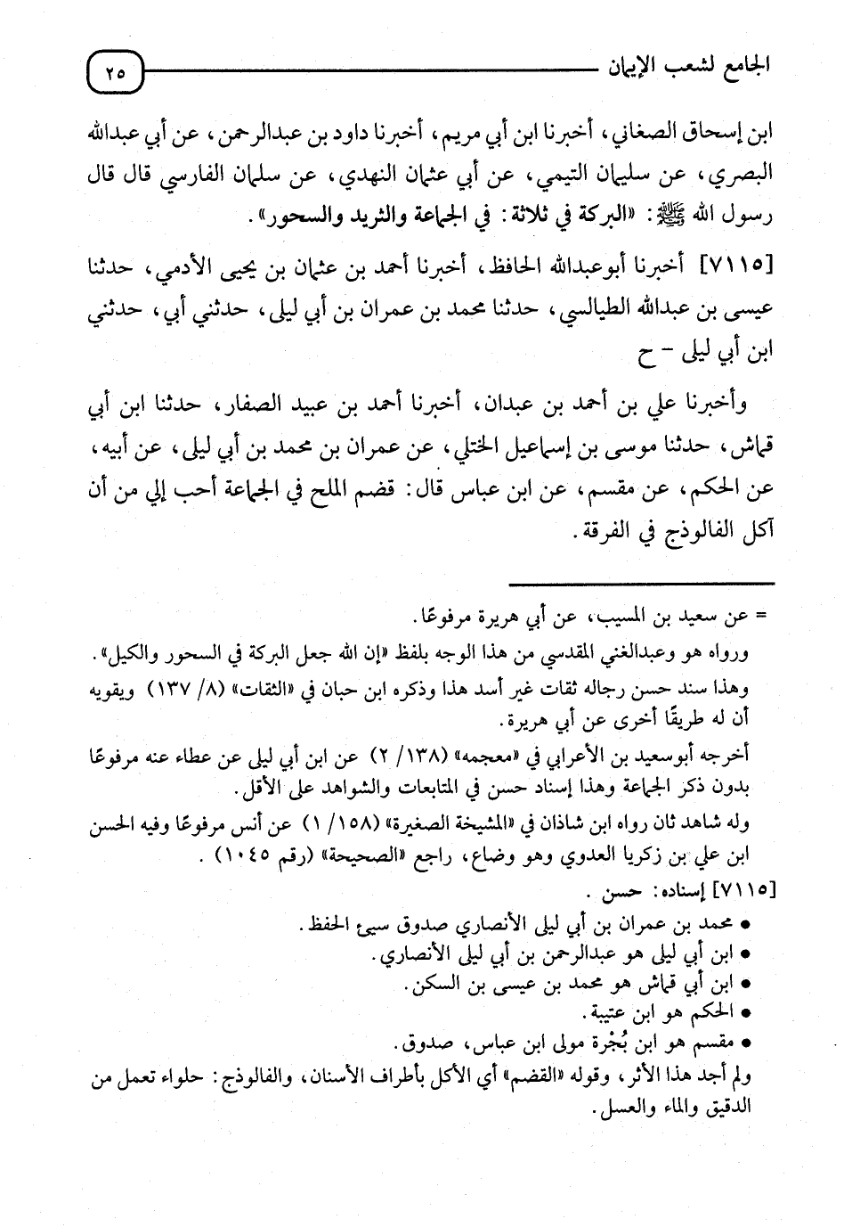 7115 - أَخْبَرَنَا أَبُو عَبْدِ اللهِ الْحَافِظُ، أنا أَحْمَدُ بْنُ عُثْمَانَ بْنِ يَحْيَى الْأَدَمِيُّ، نا عِيسَى بْنُ عَبْدِ اللهِ الطَّيَالِسِيُّ، نا مُحَمَّدُ بْنُ عِمْرَانَ بْنِ أَبِي لَيْلَى، حَدَّثَنِي ابْنُ أَبِي لَيْلَى، ح وَأَخْبَرَنَا عَلِيُّ بْنُ أَحْمَدَ بْنِ عَبْدَانَ، أنا أَحْمَدُ بْنُ عُبَيْدٍ الصَّفَّارُ، نا ابْنُ أَبِي قَمَّاشٍ، نا مُوسَى بْنُ إِسْمَاعِيلَ الْجَبَلِيُّ، عَنْ عِمْرَانَ، عَنْ مُحَمَّدِ بْنِ أَبِي لَيْلَى، عَنْ أَبِيهِ، عَنِ الْحَكَمِ، عَنْ مِقْسَمٍ، عَنِ ابْنِ عَبَّاسٍ، قَالَ: §" قَضْمُ الْمِلْحِ فِي الْجَمَاعَةِ أَحَبُّ إِلَيَّ مِنْ أَكَلِ الْفَالَوْذَجِ فِي الْفُرْقَةِ "
