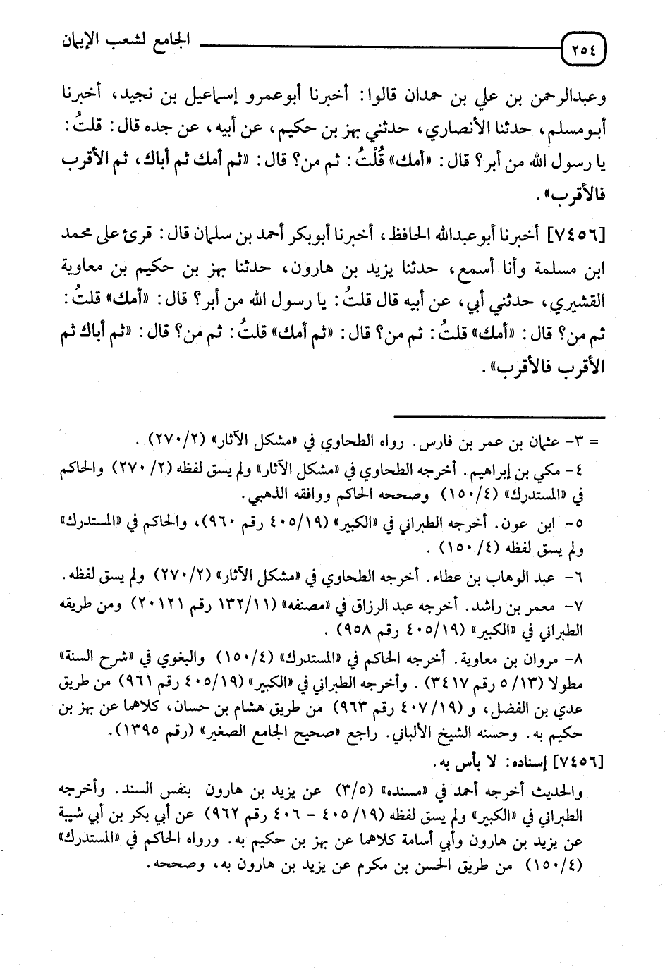 7456 - أَخْبَرَنَا أَبُو عَبْدِ اللهِ الْحَافِظُ، نا أَبُو بَكْرٍ أَحْمَدُ بْنُ سَلْمَانَ، قَالَ: قُرِئَ عَلَى مُحَمَّدِ بْنِ مَسْلَمَةَ وَأنا أَسْمَعُ نا يَزِيدُ بْنُ هَارُونَ، أنا بَهْزُ بْنُ حَكِيمِ بْنِ مُعَاوِيَةَ الْقُشَيْرِيُّ، حَدَّثَنِي أَبِي، عَنْ أَبِيهِ، قَالَ: قُلْتُ: يَا رَسُولَ اللهِ، §مَنْ أَبَرُّ؟ قَالَ: " أُمُّكَ "، قُلْتُ: ثُمَّ مَنْ؟ قَالَ: " أُمُّكَ "، قُلْتُ: ثُمَّ مَنْ؟ قَالَ: " أُمُّكَ "، قُلْتُ: ثُمَّ مَنْ؟ قَالَ: " ثُمَّ أَبَاكَ، ثُمَّ الْأَقْرَبَ فَالْأَقْرَبَ "