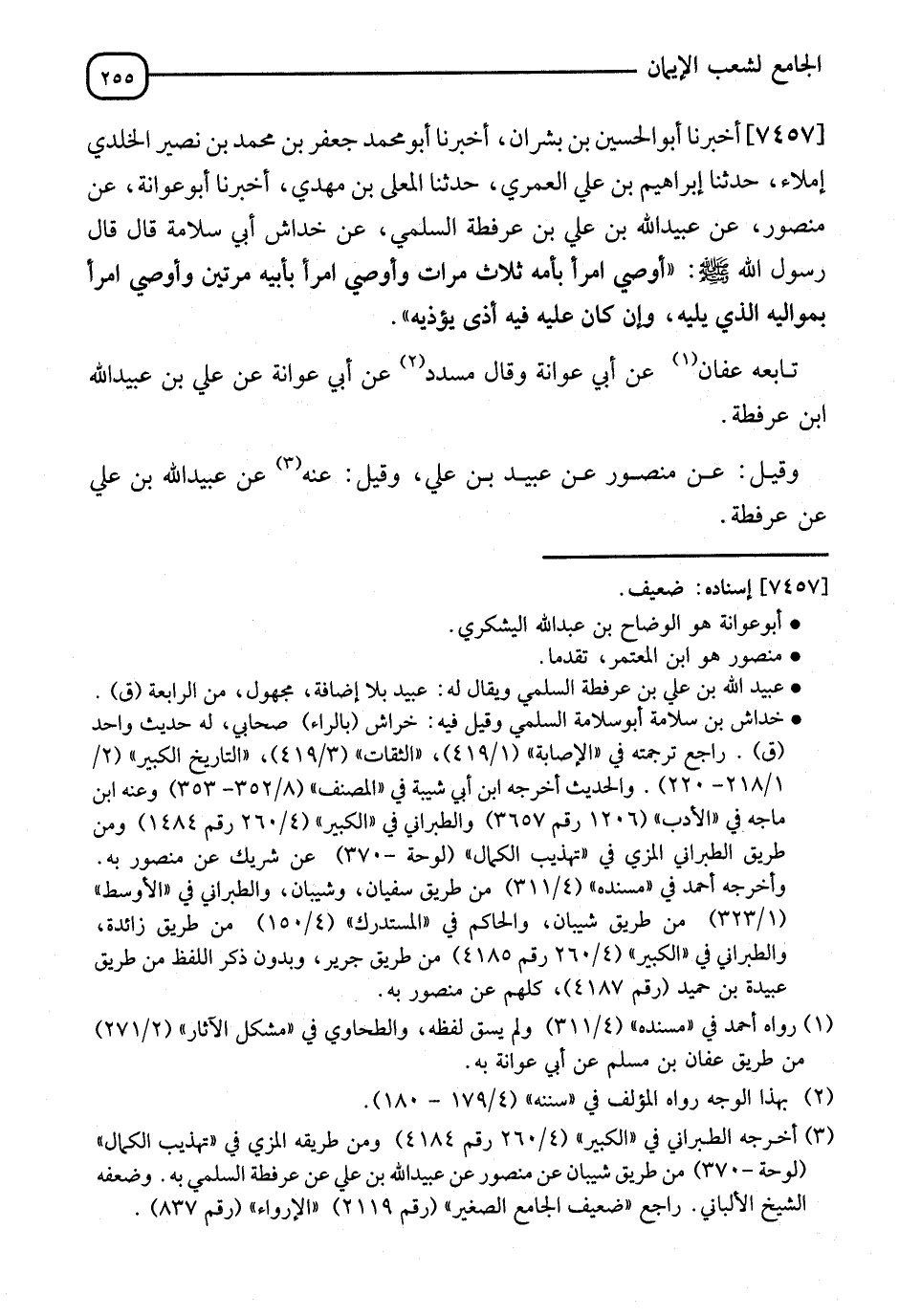 7457 - أَخْبَرَنَا أَبُو الْحُسَيْنِ بْنُ بِشْرَانَ، نا أَبُو مُحَمَّدٍ جَعْفَرُ بْنُ مُحَمَّدِ بْنِ نُصَيْرٍ الْخَلَدِيُّ إِمْلَاءً، نا إِبْرَاهِيمُ بْنُ عَلِيٍّ الْعُمَرِيُّ، نا الْمُعَلَّى بْنُ مَهْدِيٍّ، أنا أَبُو عَوَانَةَ، عَنْ مَنْصُورٍ، عَنْ عُبَيْدِ اللهِ بْنِ عَلِيِّ بْنِ عُرْفُطَةَ السُّلَمِيِّ، عَنْ خِرَاشٍ أَبِي سَلَامٍ، قَالَ: قَالَ رَسُولُ اللهِ صَلَّى اللَّهُ عَلَيْهِ وَسَلَّمَ: " §أُوصِي امْرَأً بِأُمِّهِ ثَلَاثَ مَرَّاتٍ، وَأُوصِي امْرَأً بِأَبِيهِ مَرَّتَيْنِ، أُوصِي امْرَأً بِمَوَالِيهِ الَّذِي يَلِيهِ، وَإِنْ كَانَ عَلَيْهِ مِنْهُ أَدْنَى يُؤَدِّيهِ " تَابَعَهُ عَفَّانُ، عَنْ أَبِي عَوَانَةَ، وَقَالَ مُسَدَّدٌ: عَنْ أَبِي عَوَانَةَ، عَنْ عَلِيِّ بْنِ عُبَيْدِ اللهِ بْنِ عُرْفُطَةَ