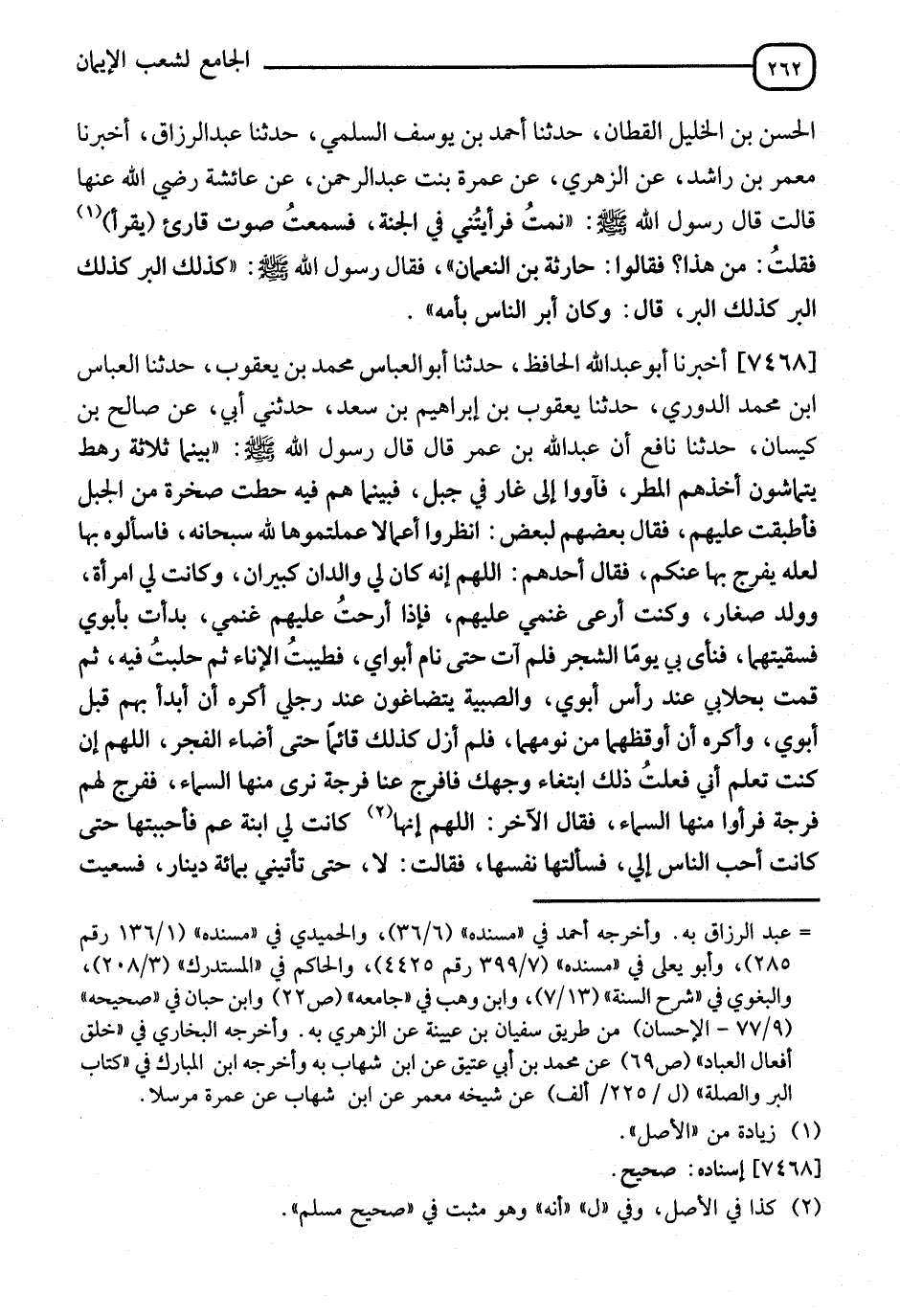 7468 - أَخْبَرَنَا أَبُو عَبْدِ اللهِ الْحَافِظُ، نا أَبُو الْعَبَّاسِ مُحَمَّدُ بْنُ يَعْقُوبَ، نا الْعَبَّاسُ بْنُ مُحَمَّدٍ الدُّورِيُّ، نا يَعْقُوبُ بْنُ إِبْرَاهِيمَ بْنِ سَعْدٍ، حَدَّثَنِي أَبِي، عَنْ صَالِحِ بْنِ كَيْسَانَ، نا نَافِعٌ، أَنَّ عَبْدَ اللهِ بْنَ عُمَرَ، قَالَ: قَالَ رَسُولُ اللهِ صَلَّى اللَّهُ عَلَيْهِ وَسَلَّمَ: " §بَيْنَمَا ثَلَاثَةُ رَهْطٍ يَتَمَاشَوْنَ، أَخَذَهُمُ الْمَطَرُ، فَأَوَوْا إِلَى غَارٍ فِي جَبَلٍ، فَبَيْنَمَا هُمْ فِيهِ حَطَّتْ صَخْرَةٌ مِنَ الْجَبَلِ، فَأَطْبَقَتْ عَلَيْهِمْ، فَقَالَ بَعْضُهُمْ لِبَعْضٍ: انْظُرُوا أَعْمَالًا عَمِلْتُمُوهَا لِلَّهِ سُبْحَانَهُ واسْأَلُوهُ بِهَا، لَعَلَّهُ يُفَرِّجُ بِهَا عَنْكُمْ، فَقَالَ أَحَدُهُمُ: اللهُمَّ إِنَّهُ كَانَ لِي وَالِدَانِ كَبِيرَانِ، وَكَانَتْ لِيَ امْرَأَةٌ، وَوَلَدٌ صِغَارٌ، وَكُنْتُ أَرْعَى غَنَمِي عَلَيْهِمْ، فَإِذَا رُحْتُ غَنَمِي عَلَيْهِمْ بَدَأْتُ بِأَبَوَيَّ فَسَقَيْتُهُمَا، فَنَأَى بِيَ يَوْمًا الشَّجَرُ، فَلَمْ آتِ حَتَّى نَامَ أَبَوَايَ، فَطيَّبَتُ الْإِنَاءَ، ثُمَّ حَلَبْتُ فِيهِ، ثُمَّ قُمْتُ بِحِلَابِي عِنْدَ رَأْسِ أَبَوَيَّ، وَالصِّبْيَةُ يَتَضَاغَوْنَ عِنْدَ رِجْلِي، أَكْرَهُ أَنْ أَبْدَأَ بِهِمْ قَبْلَ أَبَوَيَّ، وَأَكْرَهُ أَنْ أُوقِظَهُمَا مِنْ نَوْمِهِمَا، فَلَمْ أَزَلْ كَذَلِكَ حَتَّى أَضَاءَ الْفَجْرُ، اللهُمَّ إِنْ كُنْتَ تَعْلَمُ أَنِّي فَعَلْتُ ذَلِكَ ابْتِغَاءَ وَجْهِكِ، فَافْرُجْ عَنَّا فُرْجَةً نَرَى مِنْهَا السَّمَاءَ، فَفُرِجَ لَهُمْ فُرْجَةٌ، فَرَأَوْا مِنْهَا السَّمَاءَ، وَقَالَ الْآخَرُ: اللهُمَّ إِنَّهَا كَانَتْ لِيَ ابْنَةُ عَمٍّ فَأَحْبَبْتُهَا حَتَّى كَانَتْ أَحَبَّ النَّاسِ إِلَيَّ، فَسَأَلْتُهَا نَفْسَهَا فَقَالَتْ: لَا حَتَّى تَأْتِيَنِي بِمِائَةِ دِينَارٍ، فَسَعَيْتُ -[263]- حَتَّى جَمَعْتُ مِائَةَ دِينَارٍ فَأَتَيْتُهَا بِهَا، فَلَمَّا كُنْتُ بَيْنَ رِجْلَيْهَا، قَالَتِ: اتَّقِ اللهَ، وَلَا تَفْتَحِ الْخَاتَمَ إِلَّا بِحَقِّهِ، فَقُمْتُ عَنْهَا، اللهُمَّ إِنْ كُنْتَ تَعْلَمُ أَنِّي فَعَلْتُ ذَلِكَ ابْتِغَاءَ وَجْهِكَ فَافْرُجْ لَنَا فُرْجَةً، فَفُرِجَ لَهُمْ فِيهَا فُرْجَةٌ، فَقَالَ الثَّالِثُ: اللهُمَّ إِنِّي كُنْتُ اسْتَأْجَرْتُ أَجِيرًا بِفَرَقِ ذُرَةٍ، فَلَمَّا قَضَى عَمَلَهُ عَرَضْتُ عَلَيْهِ فَأَبَى أَنْ يَأْخُذَهُ وَرَغِبَ عَنْهُ، فَلَمْ أَزَلْ أَعْمَلُ بِهِ حَتَّى جَمَعْتُ مِنْهُ بَقَرًا وَرَاعِيَهَا، فَجَاءَنِي فَقَالَ: اتَّقِ اللهَ وَأَعْطِنِي حَقِّي وَلَا تَظْلِمْنِي، فَقُلْتُ لَهُ: اذْهَبْ إِلَى تِلْكَ الْبَقَرِ وَرَاعِيَهَا فَخُذْهَا، فَقَالَ: اتَّقِ اللهَ وَلَا تَهْزَأْ بِي، فَقُلْتُ: إِنِّي لَا أَهْزَأُ بِكَ، فَاذْهَبْ إِلَى تِلْكِ الْبَقَرِ وارْعَهَا فَخُذْهَا، فَاسْتَاقَهَا، اللهُمَّ إِنْ كُنْتَ تَعْلَمُ أَنِّي فَعَلْتُ ذَلِكَ ابْتِغَاءَ وَجْهِكَ فَافْرُجْ عَنَّا مَا بَقِيَ مِنَّا، فَفَرَّجَ اللهُ عَنْهُمْ، فَخَرَجُوا يَتَمَاشَوْنَ " رَوَاهُ مُسْلِمٌ فِي الصَّحِيحِ، عَنْ زُهَيْرِ بْنِ حَرْبٍ، وَغَيْرِهِ، عَنْ يَعْقُوبَ بْنِ إِبْرَاهِيمَ، وَأَخْرَجَاهُ مِنْ وَجْهٍ آخَرَ