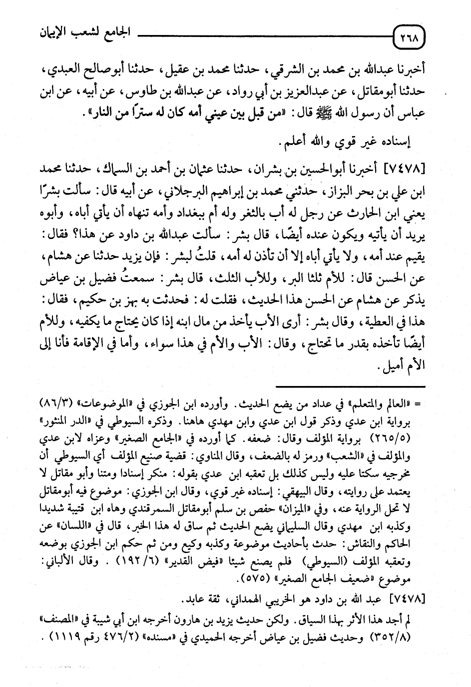 7478 - أَخْبَرَنَا أَبُو الْحُسَيْنِ بْنُ بِشْرَانَ، نا عُثْمَانُ بْنُ أَحْمَدَ بْنِ السَّمَّاكِ، نا مُحَمَّدُ بْنُ عَلِيِّ بْنِ بَحْرٍ الْبَزَّازُ، حَدَّثَنِي مُحَمَّدُ بْنُ إِبْرَاهِيمَ الْبَرْحَلَانِيُّ، عَنْ أَبِيهِ، قَالَ: سَأَلْتُ بَشَرًا يَعْنِي ابْنَ الْحَارِثِ، عَنْ رَجُلٍ لَهُ أَبٌ بِالثَّغْرِ، وَلَهُ أُمٌّ بِبَغْدَادَ، وَأُمُّهُ تَنْهَاهُ أَنْ يَأْتِيَ أَبَاهُ، وَأَبُوهُ يُرِيدُ أَنْ يَأْتِيَهُ، وَيَكُونَ عِنْدَهُ أَيْضًا؟ قَالَ بِشْرٌ: سَأَلْتُ عَبْدَ اللهِ بْنَ دَاوُدَ عَنْ هَذَا فَقَالَ: " §يُقِيمُ عِنْدَ أُمِّهِ، وَلَا يَأْتِي أَبَاهُ إِلَّا أَنْ تَأْذَنَ لَهُ أُمُّهُ "