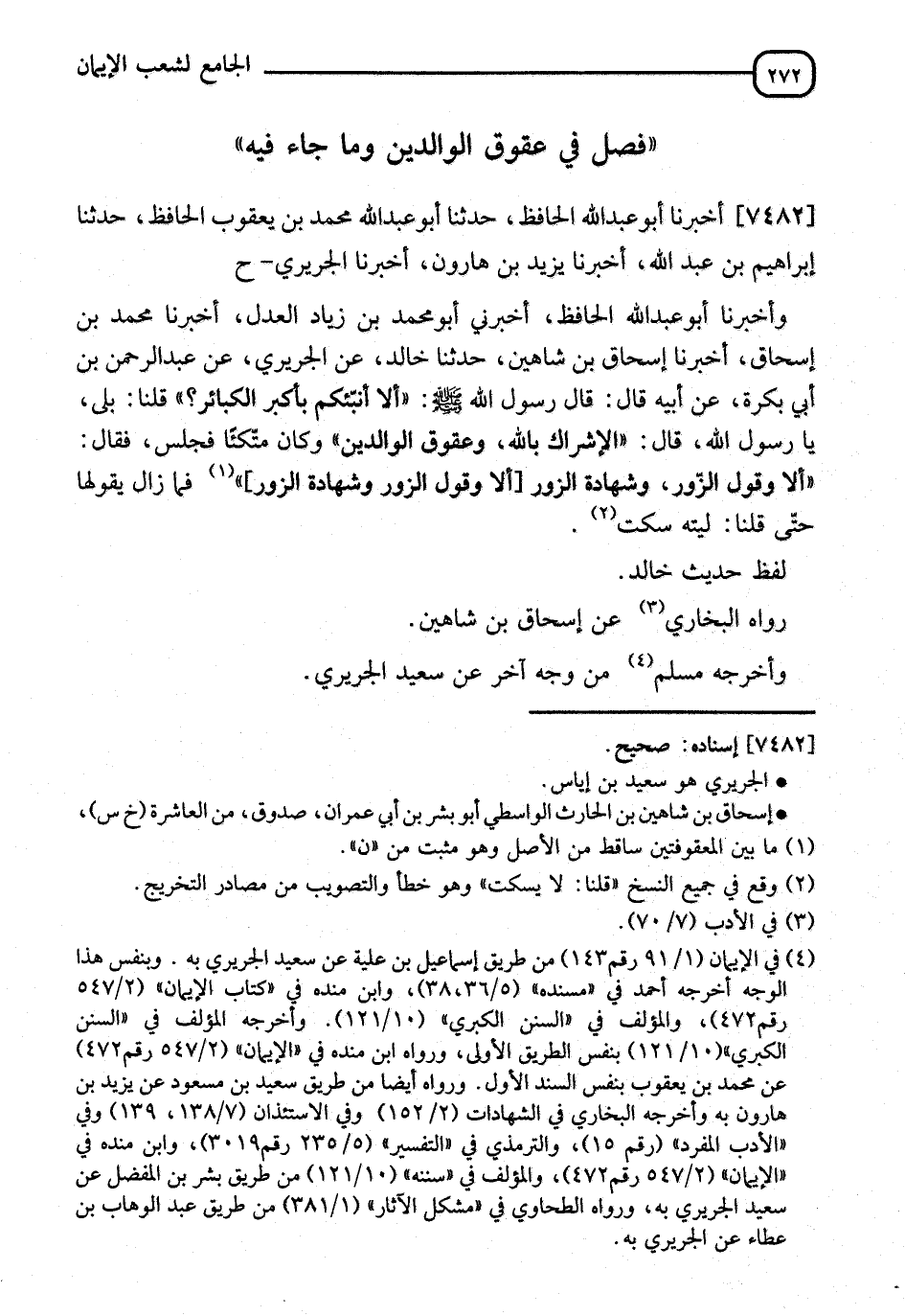 7482 - أَخْبَرَنَا أَبُو عَبْدِ اللهِ الْحَافِظُ، نا أَبُو عَبْدِ اللهِ مُحَمَّدُ بْنُ يَعْقُوبَ الْحَافِظُ، نا إِبْرَاهِيمُ بْنُ عَبْدِ اللهِ، أنا يَزِيدُ بْنُ هَارُونَ، أنا الْجُرَيْرِيُّ، ح وَأَخْبَرَنَا أَبُو عَبْدِ اللهِ الْحَافِظُ، أَخْبَرَنِي أَبُو مُحَمَّدِ بْنُ زِيَادٍ الْعَدْلُ، أنا مُحَمَّدُ بْنُ إِسْحَاقَ، أنا إِسْحَاقُ بْنُ شَاهِينَ، نا خَالِدٌ، عَنِ الْجُرَيْرِيِّ، عَنْ عَبْدِ الرَّحْمَنِ بْنِ أَبِي بَكْرَةَ، عَنْ أَبِيهِ، قَالَ: قَالَ رَسُولُ اللهِ صَلَّى اللَّهُ عَلَيْهِ وَسَلَّمَ: " §أَلَا أُنَبِّئُكُمْ بِأَكْبَرِ الْكَبَائِرِ؟ " قَالَ: قُلْنَا: بَلَى يَا رَسُولَ اللهِ، قَالَ: " الْإِشْرَاكُ بِاللهِ، وَعُقُوقُ الْوَالِدَيْنِ " وَكَانَ مُتَّكِئًا فَجَلَسَ فَقَالَ: " أَلَا وَقَوْلَ الزُّورِ، وَشَهَادَةَ الزُّورِ "، فَمَا زَالَ يَقُولُهَا حَتَّى قُلْنَا: لَا يَسْكُتُ لَفْظُ حَدِيثِ خَالِدٍ، رَوَاهُ الْبُخَارِيُّ فِي الصَّحِيحِ، عَنْ إِسْحَاقَ بْنِ شَاهِينَ، وَأَخْرَجَهُ مُسْلِمٌ مِنْ وَجْهٍ آخَرَ، عَنْ سَعِيدٍ الْجُرَيْرِيِّ