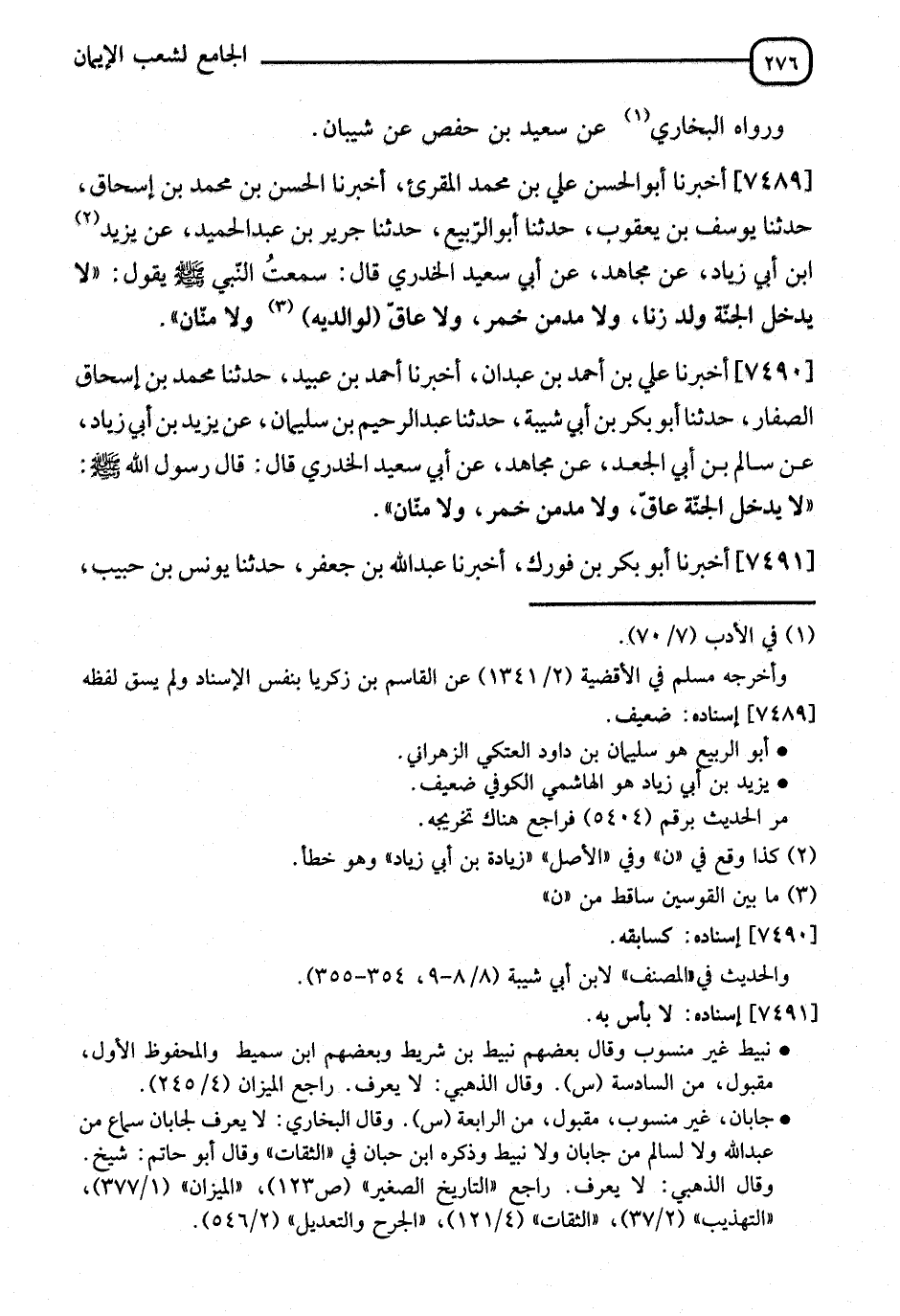 7490 - أَخْبَرَنَا عَلِيُّ بْنُ أَحْمَدَ بنِ عَبْدَانَ، أنا أَحْمَدُ بْنُ عُبَيْدٍ، نا مُحَمَّدُ بْنُ إِسْحَاقَ الصَّفَّارُ، نا أَبُو بَكْرِ بْنُ أَبِي شَيْبَةَ، نا عَبْدُ الرَّحِيمِ بْنُ سُلَيْمَانَ، عَنْ يَزِيدَ بْنِ أَبِي زِيَادٍ، عَنْ سَالِمِ بْنِ أَبِي الْجَعْدِ، عَنْ مُجَاهِدٍ، عَنْ أَبِي سَعِيدٍ الْخُدْرِيِّ، قَالَ: قَالَ رَسُولُ اللهِ صَلَّى اللَّهُ عَلَيْهِ وَسَلَّمَ: " §لَا يَدْخُلُ الْجَنَّةَ عَاقٌّ، وَلَا مُدْمِنُ خَمْرٍ، وَلَا مَنَّانٌ "