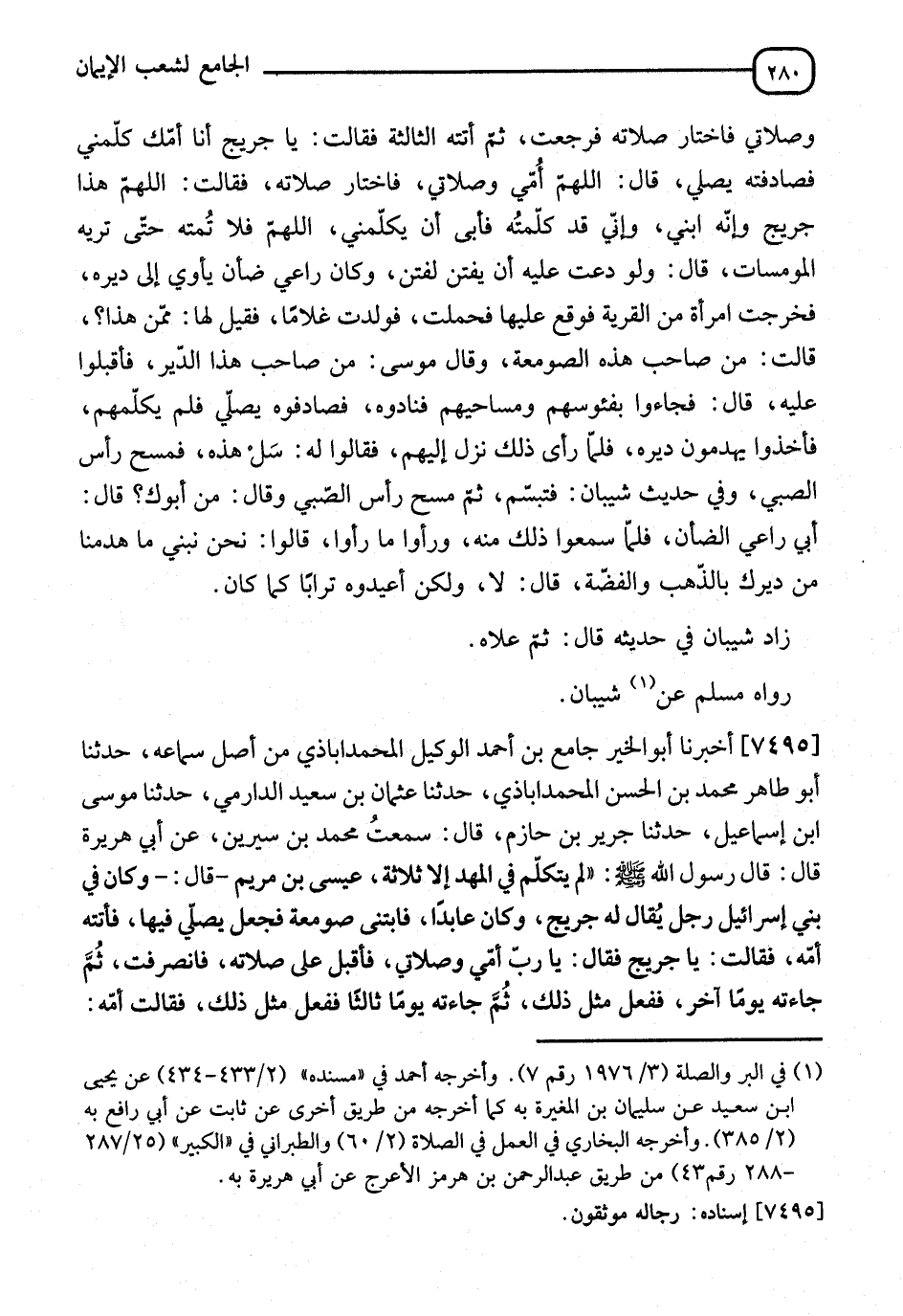 7495 - أَخْبَرَنَا أَبُو الْخَيْرِ جَامِعُ بْنُ أَحْمَدَ الْوَكِيلُ الْمُحَمَّدْ أَبَادِيُّ مِنْ أَصْلِ سَمَاعِهِ، نا أَبُو طَاهِرٍ مُحَمَّدُ بْنُ الْحَسَنِ الْمُحَمَّد آبَادِيُّ، نا عُثْمَانُ بْنُ سَعِيدٍ الدَّارِمِيُّ، نا مُوسَى بْنُ إِسْمَاعِيلَ، نا جَرِيرُ بْنُ حَازِمٍ، قَالَ: سَمِعْتُ مُحَمَّدَ بْنَ سِيرِينَ، عَنْ أَبِي هُرَيْرَةَ، قَالَ: قَالَ رَسُولُ اللهِ صَلَّى اللَّهُ عَلَيْهِ وَسَلَّمَ: " §لَمْ يَتَكَلَّمْ فِي الْمَهْدِ إِلَّا ثَلَاثَةٌ: عِيسَى ابْنُ مَرْيَمَ، قَالَ: وَكَانَ فِي بَنِي إِسْرَائِيلَ رَجُلٌ يُقَالُ لَهُ: جُرَيْجٌ، وَكَانَ عَابِدًا، فَابْتَنَى صَوْمَعَةً فَجَعَلَ يُصَلِّي فِيهَا، فَأَتَتْهُ أُمُّهُ، فَقَالَتْ: يَا جُرَيْجُ، فَقَالَ: يَا رَبِّ أُمِّي وَصَلَاتِي، فَأَقْبَلَ عَلَى صَلَاتِهِ، فَانْصَرَفَتْ ثُمَّ جَاءَتْهُ يَوْمًا آخَرَ فَفَعَلَ مِثْلَ ذَلِكَ، ثُمَّ جَاءَتْهُ يَوْمًا ثَالِثًا فَفَعَلَ مِثْلَ ذَلِكَ، فَقَالَتْ لَهُ أُمُّهُ: -[281]- اللهُمَّ لَا تُمِتْهُ حَتَّى يَرَى أَوْ يَنْظُرَ فِي وُجُوهِ الْمُومِسَاتِ، قَالَ: فَذَكَرَ يَوْمًا بَنُو إِسْرَائِيلَ جُرَيْجًا وَفَضْلَهُ، فَقَالَتْ: بَغِيٌّ مِنْ بَغَايَا بَنِي إِسْرَائِيلَ: إِنْ شِئْتُمْ لَأَفْتِنَنَّهُ لَكُمْ، فَقَالُوا: قَدْ شِئْنَا، فَانْطَلَقَتْ فَعَرَضَتْ لِجُرَيْجٍ فَلَمْ يَلْتَفِتْ إِلَيْهَا، فَأَتَتْ رَاعِيًا كَانَ يَأْوِي إِلَى صَوْمَعَةِ جُرَيْجٍ بِغَنَمِهِ، فَأَمْكَنَتْهُ مِنْ نَفْسِهَا فَحَمَلَتْ فَوَلَدَتْ غُلَامًا، فَقَالَتْ: هُوَ مِنْ جُرَيْجٍ، فَأَتَاهُ بَنُو إِسْرَائِيلَ فَضَرَبُوهُ وَشَتَمُوهُ وَهَدَمُوا صَوْمَعَتَهُ، فَقَالَ: مَا شَأْنُكُمْ؟ فَقَالُوا: زَنَيْتَ بِهَذِهِ الْبَغِيِّ، وَوَلَدَتْ غُلَامًا، قَالَ: فَأَيْنَ الْغُلَامُ؟ قَالَ: فَجِيءَ بِهِ فَقَامَ وَصَلَّى وَدَعَا، ثُمَّ انْصَرَفَ إِلَى الْغُلَامِ فَطَعَنَهُ بِإِصْبَعِهِ فِي صَدْرِهِ وَقَالَ: يَا غُلَامُ، مَنْ أَبُوكَ؟ قَالَ: أَبِي الرَّاعِي، قَالَ فَوَثَبَ النَّاسُ إِلَيْهِ فَجَعَلُوا يُقَبِّلُونَهُ وَقَالُوا: نَبْنِي صَوْمَعَتَكَ مِنْ ذَهَبٍ، قَالَ: لَا حَاجَةَ لِي فِي ذَلِكَ، ابْنُوهَا كَمَا كَانَتْ مِنْ قَبْلُ، وَبَيْنَا امْرَأَةٌ جَالِسَةٌ وَفِي حَجْرِهَا ابْنٌ لَهَا تُرْضِعُهُ إِذْ مَرَّ بِهَا رَاكِبٌ ذُو شَارَةٍ، فَقَالَتِ: اللهُمَّ اجْعَلِ ابْنِي مِثْلَ هَذَا، فَتَرَكَ ثَدْيَهَا، ثُمَّ أَقْبَلَ عَلَى الرَّاكِبِ فَنَظَرَ إِلَيْهِ فَقَالَ: اللهُمَّ لَا تَجْعَلْنِي مِثْلَ هَذَا، ثُمَّ أَقْبَلَ عَلَى ثَدْيِهَا يَمَصُّهُ " قَالَ أَبُو هُرَيْرَةَ: فَكَأَنِّي أَنْظُرُ إِلَى رَسُولِ اللهِ صَلَّى اللَّهُ عَلَيْهِ وَسَلَّمَ يَحْكِي مَصَّهُ، وَوَضْعَهُ إِصْبَعَهُ فِي فِيهِ، فَجَعَلَ يَمُصُّهَا، ثُمَّ مُرَّ بِأَمَةٍ مَعَهَا النَّاسُ تُضْرَبُ، فَقَالَتِ: اللهُمَّ لَا تَجْعَلِ ابْنِي مِثْلَ هَذِهِ، فَتَرَكَ ثَدْيَهَا وَنَظَرَ إِلَيْهَا وَقَالَ: اللهُمَّ اجْعَلْنِي مِثْلَهَا، فَعِنْدَ ذَلِكَ تَرَاجَعَا الْحَدِيثَ، فَقَالَتْ: حَلْقَى، أَيْ بُنَيَّ، مَرَّ بِيَ الرَّاكِبُ ذُو شَارَةٍ، فَقُلْتُ: اللهُمَّ اجْعَلِ ابْنِي مِثْلَ هَذَا، فَقُلْتَ: اللهُمَّ لَا تَجْعَلْنِي مِثْلَهُ، ثُمَّ مُرَّ بِهَذِهِ الْأَمَةِ فَقُلْتُ: اللهُمَّ لَا تَجْعَلِ ابْنِي مِثْلَ هَذِهِ الْأَمَةِ، فَقُلْتَ: اللهُمَّ اجْعَلْنِي مِثْلَهَا، فَقَالَ: يَا أُمَّتَاهُ، إِنَّ الرَّاكِبَ الَّذِي مَرَّ بِكِ جَبَّارٌ، فَدَعَوْتِ اللهَ أَنْ يَجْعَلَنِي مِثْلَهُ فَقُلْتُ: اللهُمَّ لَا تَجْعَلْنِي مِثْلَهُ، وَهَذِهِ يَقُولُونَ: سَرَقْتِ، وَلَمْ تَسْرِقْ، وَزَنَتْ، وَلَمْ تَزْنِ، وَهِيَ تَقُولُ: حَسْبِيَ اللهُ " رَوَاهُ الْبُخَارِيُّ، عَنْ مُسْلِمِ بْ