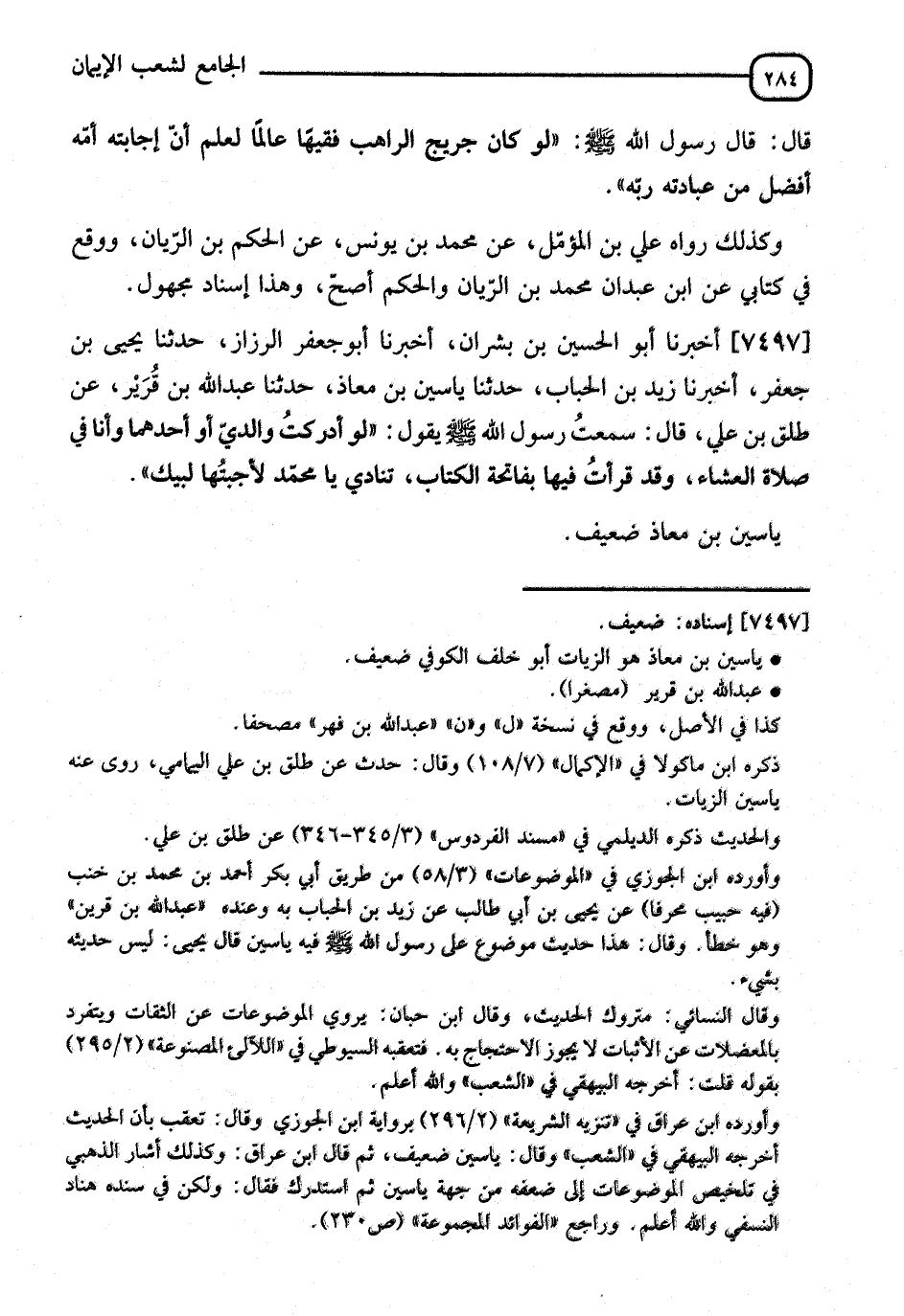 7497 - أَخْبَرَنَا أَبُو الْحُسَيْنِ بْنُ بِشْرَانَ، أنا أَبُو جَعْفَرٍ الرَّزَّازُ، نا يَحْيَى بْنُ جَعْفَرٍ، أنا زَيْدُ بْنُ الْحُبَابِ، نا يَاسِينُ بْنُ مُعَاذٍ، نا عَبْدُ اللهِ بْنُ مَرْثَدٍ، عَنْ طَلْقِ بْنِ عَلِيٍّ، قَالَ: سَمِعْتُ رَسُولَ اللهِ صَلَّى اللَّهُ عَلَيْهِ وَسَلَّمَ يَقُولُ: " §لَوْ أَدْرَكْتُ وَالِدَيَّ أَوْ أَحَدَهُمَا وَأَنَا فِي صَلَاةِ الْعِشَاءِ، وَقَدْ قَرَأْتُ فِيهَا بِفَاتِحَةِ الْكِتَابِ تُنَادِي: يَا مُحَمَّدُ، لَأَجَبْتُهَا: لَبَّيْكِ " يَاسِينُ بْنُ مُعَاذٍ ضَعِيفٌ
