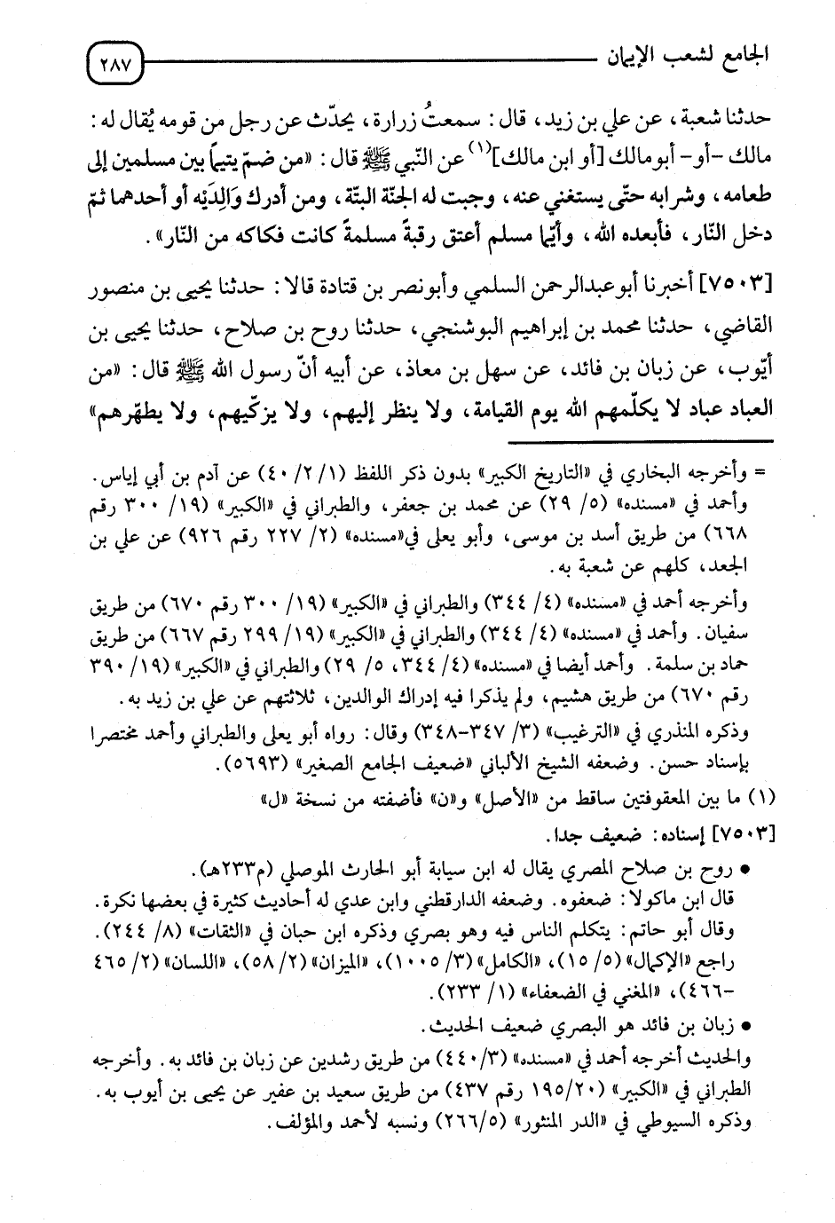 7503 - أَخْبَرَنَا أَبُو عَبْدِ الرَّحْمَنِ السُّلَمِيُّ، وَأَبُو نَصْرِ بْنُ قَتَادَةَ، قَالَا: نا يَحْيَى بْنُ مَنْصُورٍ الْقَاضِي، نا مُحَمَّدُ بْنُ إِبْرَاهِيمَ الْبُوشَنْجِيُّ، نا رَوْحُ بْنُ صَلَاحٍ، نا يَحْيَى بْنُ أَيُّوبَ، عَنْ زَبَّانَ بْنِ فَائِدٍ، عَنْ سَهْلِ بْنِ مُعَاذٍ، عَنْ أَبِيهِ، أَنَّ رَسُولَ اللهِ صَلَّى اللَّهُ عَلَيْهِ وَسَلَّمَ قَالَ: " §مِنَ الْعِبَادِ عِبَادٌ لَا يُكَلِّمُهُمُ اللهُ يَوْمَ الْقِيَامَةِ، وَلَا يَنْظُرُ إِلَيْهِمْ، وَلَا يُزَكِّيهِمْ، وَلَا يُطَهِّرُهُمْ "، -[288]- قَالَ: مَنْ أُولَئِكَ يَا رَسُولَ اللهِ؟ قَالَ: " الْمُتَبَرِّئُ مِنْ وَالِدَيْهِ رَغْبَةً عَنْهُمَا، والْمُتَبَرِّئُ مِنْ وَلَدِهِ، وَرَجُلٌ أَنْعَمَ عَلَيْهِ قَوْمٌ فَكَفَرَ نِعْمَتَهُمْ، وَتَبَرَّأَ مِنْهُمْ "