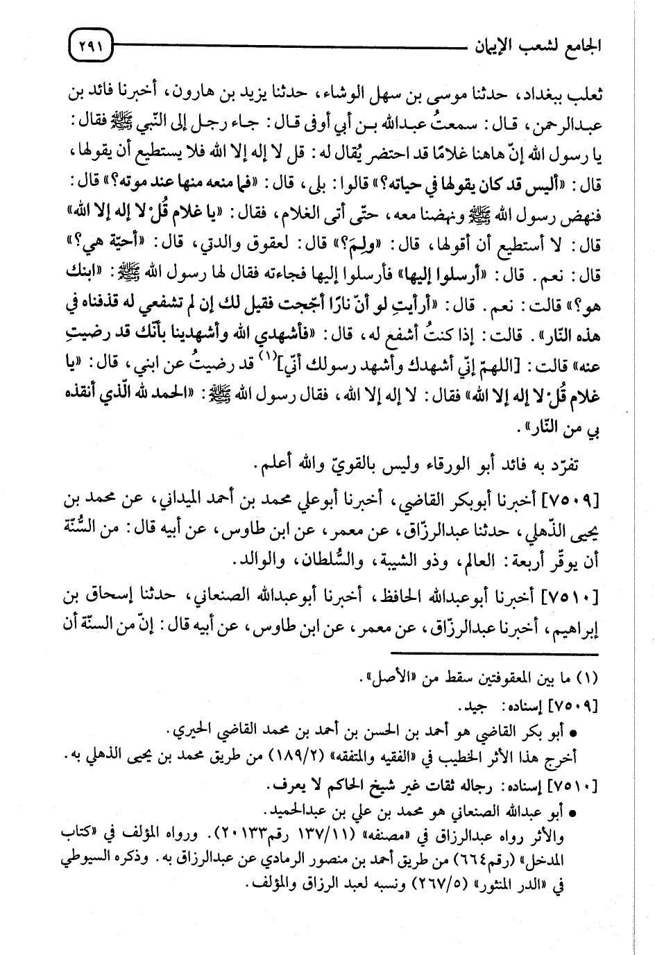 7510 - أَخْبَرَنَا أَبُو عَبْدِ اللهِ الْحَافِظُ، أنا أَبُو عَبْدِ اللهِ الصَّغَانِيُّ، نا إِسْحَاقُ بْنُ إِبْرَاهِيمَ، أنا عَبْدُ الرَّزَّاقِ، عَنْ مَعْمَرٍ، عَنِ ابْنِ طَاوُسٍ، عَنْ أَبِيهِ قَالَ: إِنَّ مِنَ السُّنَّةِ أَنْ -[292]- يُوَقَّرَ أَرْبَعَةٌ: فَذَكَرَهُمْ، وَزَادَ وَقَالَ: وَيُقَالُ: " إِنَّ مِنَ الْجَفَاءِ أَنْ يَدْعُوَ الرَّجُلُ وَالِدَهُ بِاسْمِهِ "