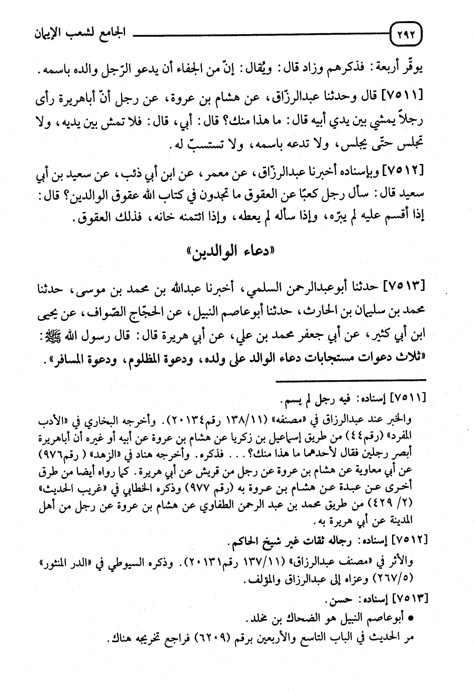 7511 - قَالَ: وَنا عَبْدُ الرَّزَّاقِ، عَنْ هِشَامِ بْنِ عُرْوَةَ، عَنْ رَجُلٍ، أَنَّ أَبَا هُرَيْرَةَ رَأَى رَجُلًا يَمْشِي بَيْنَ يَدَيْ أَبِيهِ، قَالَ: مَا هَذَا مِنْكَ؟ قَالَ: أَبِي، قَالَ: " §فَلَا تَمْشِ بَيْنَ يَدَيْهِ، وَلَا تَجْلِسْ حَتَّى يَجْلِسَ، وَلَا تَدْعُهُ بِاسْمِهِ، وَلَا تَنْتَسِبْ لَهُ "