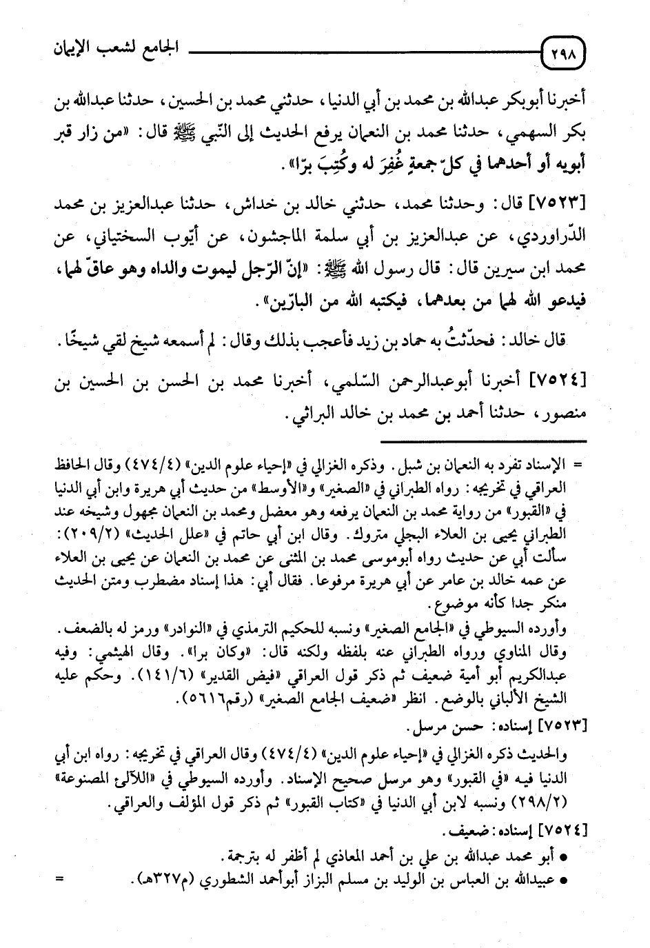7523 - قَالَ: وَحَدَّثَنِي خَالِدُ بْنُ خِرَاشٍ، نا عَبْدُ الْعَزِيزِ بْنُ مُحَمَّدٍ الدَّرَاوَرْدِيُّ، عَنْ عَبْدِ الْعَزِيزِ بْنِ أَبِي سَلَمَةَ الْمَاجِشُونِ، عَنْ أَيُّوبَ السَّخْتِيَانِيِّ، عَنْ مُحَمَّدِ بْنِ سِيرِينَ، قَالَ: قَالَ رَسُولُ اللهِ صَلَّى اللَّهُ عَلَيْهِ وَسَلَّمَ: " إِنَّ §الرَّجُلَ لَيَمُوتُ وَالِدَاهُ وَهُوَ عَاقٌّ لَهُمَا، فَيدْعُو لَهُمَا مِنْ بَعْدِ مَمَاتِهِمَا فَيَكْتُبَهُ اللهُ مِنَ الْبَارِّينَ " قَالَ خَالِدٌ: فَحَدَّثْتُ بِهِ حَمَّادَ بْنَ زَيْدٍ فَأُعْجِبَ بِذَلِكَ فَقَالَ: " لَمْ أَسْمَعْهُ شَيْخٌ لَقِيَ شَيْخًا "