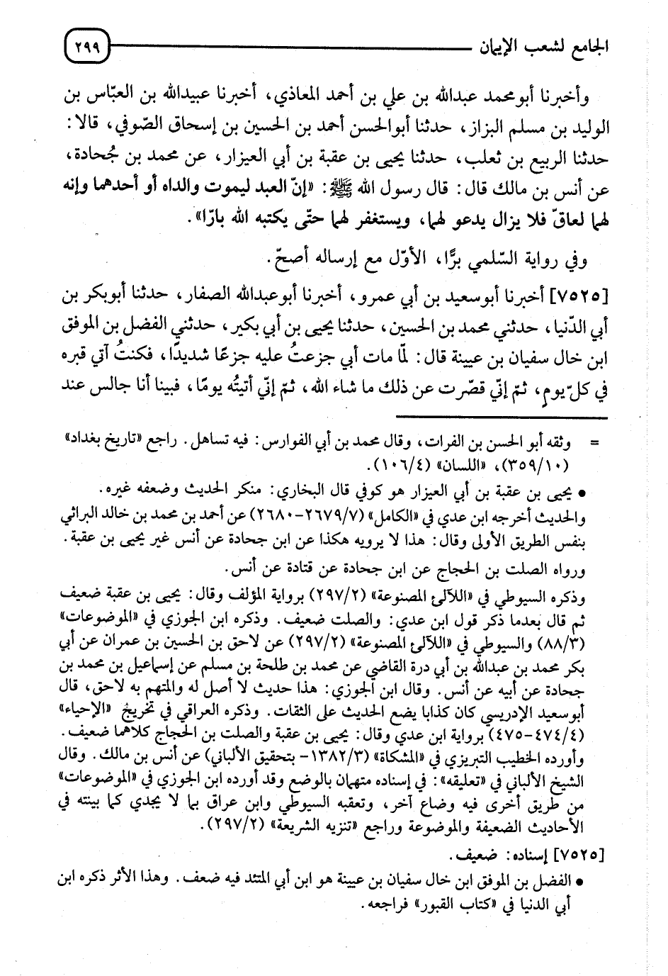 7525 - أَخْبَرَنَا أَبُو سَعِيدِ بْنُ أَبِي عَمْرٍو، أنا أَبُو عَبْدِ اللهِ الصَّفَّارُ، نا أَبُو بَكْرِ بْنُ أَبِي الدُّنْيَا، حَدَّثَنِي مُحَمَّدُ بْنُ الْحُسَيْنِ، نا يَحْيَى بْنُ أَبِي بُكَيْرٍ، حَدَّثَنِي الْفَضْلُ بْنُ الْمُوَفَّقِ ابْنُ خَالِ سُفْيَانَ بْنِ عُيَيْنَةَ، قَالَ: " §لَمَّا مَاتَ أَبِي جَزِعْتُ جَزَعًا شَدِيدًا، فَكُنْتُ آتِي قَبْرَهُ فِي كُلِّ يَوْمٍ، ثُمَّ إِنِّي قَصَّرْتُ عَنْ ذَلِكَ مَا شَاءَ اللهُ، ثُمَّ إِنِّي أَتَيْتُهُ يَوْمًا، فَبَيْنَا أَنَا جَالِسٌ عِنْدَ -[300]- الْقَبْرِ غَلَبَتْنِي عَيْنَايَ فَنِمْتُ، فَرَأَيْتُ كَأَنَّ قَبْرَ أَبِي قَدِ انْفَرَجَ، وَكَأَنَّهُ قَاعِدٌ فِي قَبْرِهِ، مُتَوَشِّحًا أَكْفَانَهُ عَلَيْهِ سِحْنَةُ الْمَوْتَى، قَالَ: كَأَنِّي بُلِيتُ لَمَّا رَأَيْتُهُ، فَقَالَ: يَا بُنَيَّ، مَا بَطَّأَ بِكَ عَنِّي؟ قَالَ: قُلْتُ: وَإِنَّكَ لَتَعْلَمُ بِمَجِيئِي؟ قَالَ: مَا جِئْتَ مِنْ مَرَّةٍ إِلَّا عَلِمْتُهَا، وَقَدْ كُنْتَ تَأْتِيَنِي فَأُسَرُّ بِكَ، وَيُسَرُّ مَنْ حَوْلِي بِدُعَائِكَ، قَالَ: فَكُنْتُ بَعْدُ آتِيَهِ كَثِيرًا "
