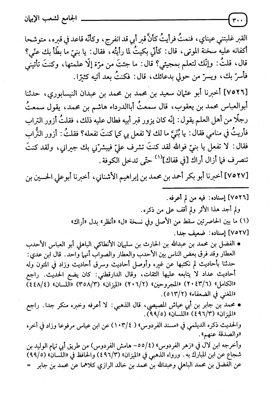 7526 - أَخْبَرَنَا أَبُو عُثْمَانَ سَعِيدُ بْنُ مُحَمَّدِ بْنِ عَبْدَانَ النَّيْسَابُورِيُّ، نا أَبُو الْعَبَّاسِ مُحَمَّدُ بْنُ يَعْقُوبَ، قَالَ: سَمِعْتُ أَبَا الدَّرْدَاءِ هَاشِمَ بْنَ مُحَمَّدٍ، يَقُولُ: سَمِعْتُ رَجُلًا، مِنْ أَهْلِ الْعِلْمِ يَقُولُ: " إِنَّهُ كَانَ §يَزُورُ قَبْرَ أَبِيهِ، فَطَالَ عَلَيْهِ ذَلِكَ، فَقُلْتُ: أَزُورُ التُّرَابَ؟ فَأُرِيتُ فِي مَنَامِي، فَقَالَ: يَا بُنَيَّ مَالَكَ لَا تَفْعَلُ بِي كَمَا كُنْتَ تَفْعَلُهُ؟ فَقُلْتُ: أَزُورُ التُّرَابَ؟ فَقَالَ: لَا تَعْجَلَ يَا بُنَيَّ، فَوَاللهِ لَقَدْ كُنْتَ تُشْرِفُ عَلَيَّ، فَيُبَشِّرَنِي بِكَ جِيرَانِي، وَلَقَدْ كُنْتَ تَنْصَرِفُ فَمَا أَزَالُ أَرَاكَ حَتَّى تَدْخُلَ الْكُوفَةَ "