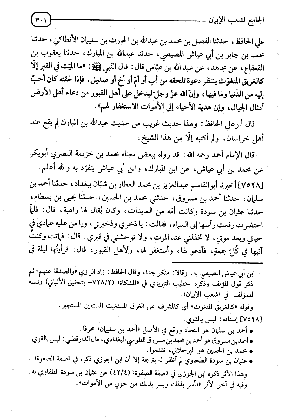 7528 - أَخْبَرَنَا أَبُو الْقَاسِمِ عَبْدُ الْعَزِيزِ بْنُ مُحَمَّدٍ الْعَطَّارِ بْنِ شُبَّانَ، بِبَغْدَادَ، نا أَحْمَدُ بْنُ سَلْمَانَ، نا أَحْمَدُ بْنُ مَسْرُوقٍ، حَدَّثَنِي مُحَمَّدُ بْنُ الْحُسَيْنِ، نا يَحْيَى بْنُ بِسْطَامٍ، نا عُثْمَانُ بْنُ سَوْدَةَ، وَكَانَتْ أُمُّهُ مِنَ الْعَابِدَاتِ، وَلِذَلِكَ يُقَالُ لَهَا: رَاهِبَةٌ قَالَ: " §فَلَمَّا احْتُضِرَتْ رَفَعَتْ رَأْسَهَا إِلَى السَّمَاءِ فَقَالَتْ: يَا ذُخْرِي، وَذَخِيرَتِي، وَيَا مَنْ عَلَيْهِ عِمَادِي فِي حَيَاتِي وَبَعْدَ مَوْتِي، لَا تَخْذُلْنِي عِنْدَ الْمَوْتِ، وَلَا تُوحِشْنِي فِي قَبْرِي "، قَالَ: " فَمَاتَتْ، وَكُنْتُ آتِيهَا فِي كُلِّ جُمُعَةٍ فَأَدْعُو لَهَا، وَأَسْتَغْفِرُ لَهَا وَلِأَهْلِ الْقُبُورِ، قَالَ: فَرَأَيْتُهَا لَيْلَةً فِي -[302]- مَنَامِي، فَقُلْتُ: يَا أُمَّاهُ، كَيْفَ أَنْتِ؟ فَقَالَتْ: يَا بُنَيَّ، إِنَّ الْمَوْتَ لَشَدِيدٌ كَرْبُهُ، وَأَنَا بِحَمْدِ اللهِ فِي بَرْزَخٍ مَحْمُودٍ، أَفْتَرِشُ فِيهِ الرَّيْحَانَ، وَأَتَوَسَّدُ فِيهِ السُّنْدُسَ، وَالْإِسْتَبْرَقَ إِلَى يَوْمِ النُّشُورِ، فَقُلْتُ: أَلَكِ حَاجَةٌ؟ قَالَتْ: نَعَمْ، قُلْتُ: مَا هِيَ؟ قَالَتْ: " لَا تَدَعْ مَا كُنْتَ تَصْنَعُ مِنْ زِيَارَتِنَا وَالدُّعَاءَ لَنَا، فَإِنِّي آنَسُ بِمَجِيئِكَ يَوْمَ الْجُمُعَةِ، إِذَا أَقْبَلْتَ مِنْ أَهْلِكَ يُقَالَ: يَا رَاهِبَةُ، قَدْ أَقْبَلَ مِنْ أَهْلِكِ زَائِرٌ، قَالَتْ: فَأُبَشَّرُ، وَيُبَشَّرُ بِذَلِكَ مَنْ حَوْلِي مِنَ الْأَمْوَاتِ "