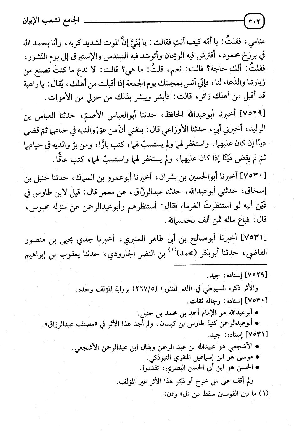 7529 - أَخْبَرَنَا أَبُو عَبْدِ اللهِ الْحَافِظُ، نا أَبُو الْعَبَّاسِ الْأَصَمُّ، نا الْعَبَّاسُ بْنُ الْوَلِيدِ، أَخْبَرَنِي أَبِي، نا الْأَوْزَاعِيُّ، قَالَ: " §بَلَغَنِي أَنَّ مَنْ عَقَّ وَالِدَيْهِ فِي حَيَاتِهِمَا، ثُمَّ قَضَى دَيْنًا إِنْ كَانَ عَلَيْهِمَا، وَاسْتَغْفَرَ لَهُمَا وَلَمْ يسْتَسِبَّ لَهُمَا كُتِبَ بَارًّا، وَمَنْ بَرَّ وَالِدَيْهِ فِي حَيَاتِهِمَا، ثُمَّ لَمْ يَقْضِ دَيْنًا إِذَا كَانَ عَلَيْهِمَا، وَلَمْ يَسْتَغْفِرْ لَهُمَا، واسْتَسَبَّ لَهُمَا كُتِبَ عَاقًّا "