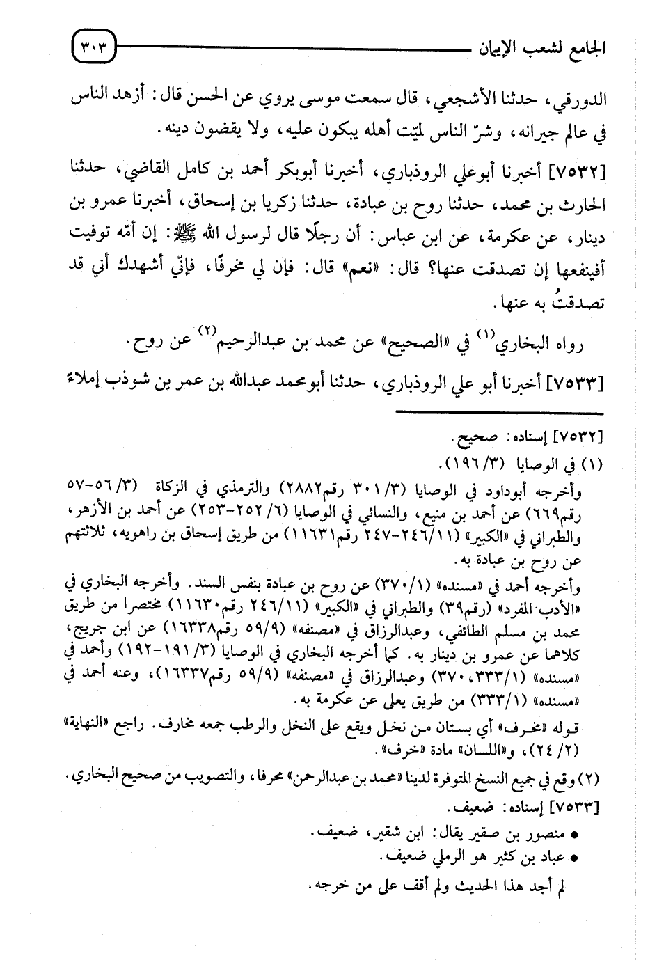 7532 - أَخْبَرَنَا أَبُو عَلِيٍّ الرُّوذْبَارِيُّ، أنا أَبُو بَكْرٍ أَحْمَدُ بْنُ كَامِلٍ الْقَاضِي، نا الْحَارِثُ بْنُ مُحَمَّدٍ، نا رَوْحُ بْنُ عُبَادَةَ، نا زَكَرِيَّا بْنُ إِسْحَاقَ، أنا عَمْرُو بْنُ دِينَارٍ، عَنْ عِكْرِمَةَ، عَنِ ابْنِ عَبَّاسٍ، أَنَّ رَجُلًا قَالَ لِرَسُولِ اللهِ صَلَّى اللَّهُ عَلَيْهِ وَسَلَّمَ: إِنَّ §أُمَّهُ تُوُفِّيَتْ، أَيَنْفَعُهَا إِنْ تَصَدَّقْتُ عَنْهَا؟ قَالَ: " نَعَمْ "، قَالَ: فَإِنَّ لِي مِحْرَافًا، فَإِنِّي أُشْهِدُكَ أَنِّي قَدْ تَصَدَّقَتُ بِهِ عَنْهَا رَوَاهُ الْبُخَارِيُّ فِي الصَّحِيحِ، عَنْ مُحَمَّدِ بْنِ عَبْدِ الرَّحْمَنِ، عَنْ رَوْحٍ